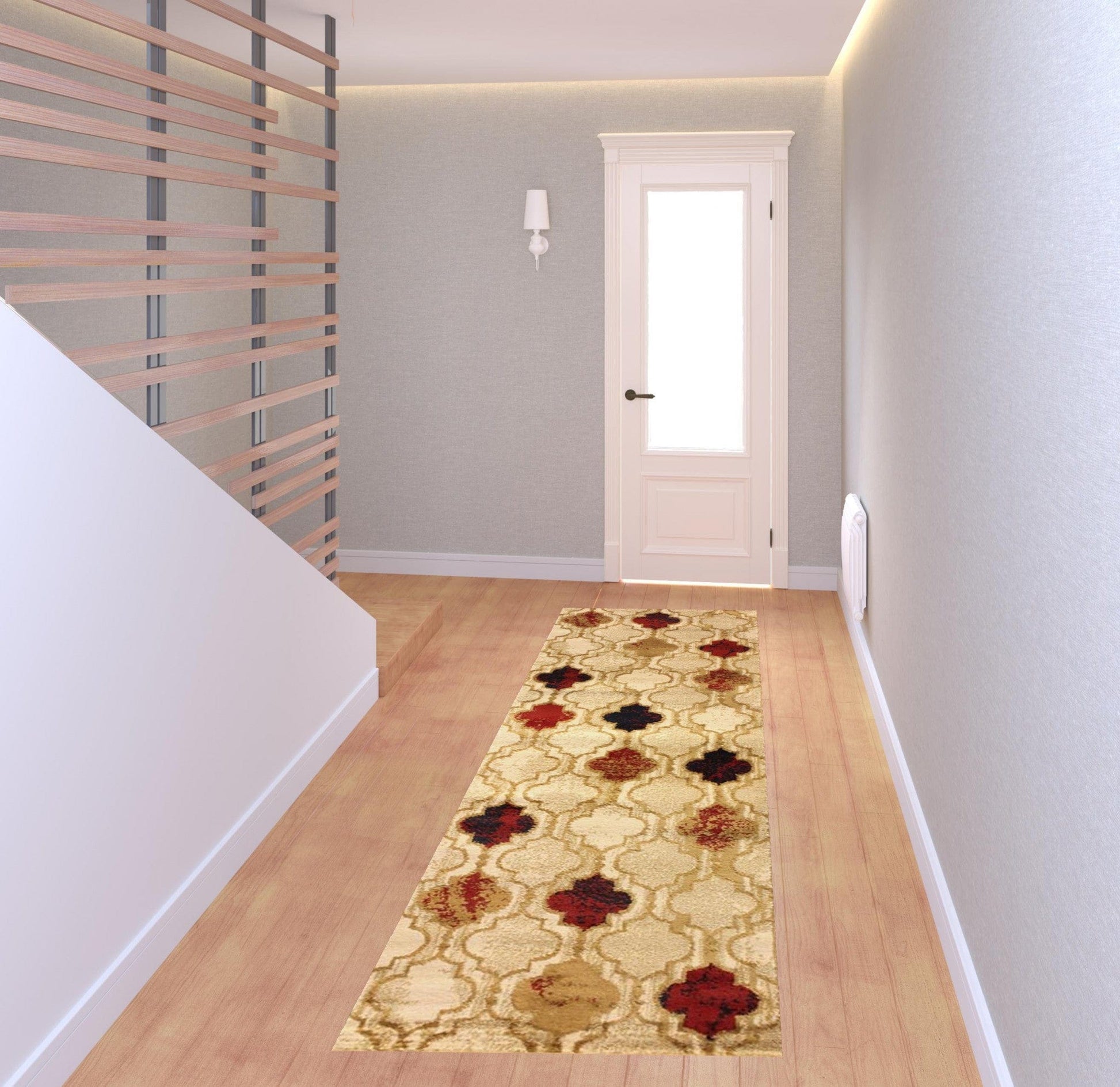 Set an inviting tone in your space with this 8' beige quatrefoil power loom distressed stain resistant runner rug. This runner shaped rug features a quatrefoil design in beige to give it visual interest. A classic shape marries with good looking design for your space The coloring of this rug adds a delightfully neutral tone to your home and will easily match with most any decor. This superior Turkish rug represents the highest quality and is built to last. Ideal for spaces with kids and pets, this rug is stain resistant to help repel stains and spilled liquids. Area Rugs help to give warmth and sense of home to your space. 0.31" H x 32.4" W x 96" D