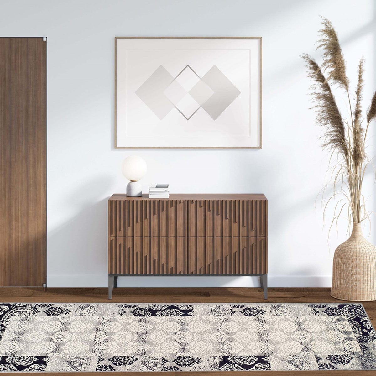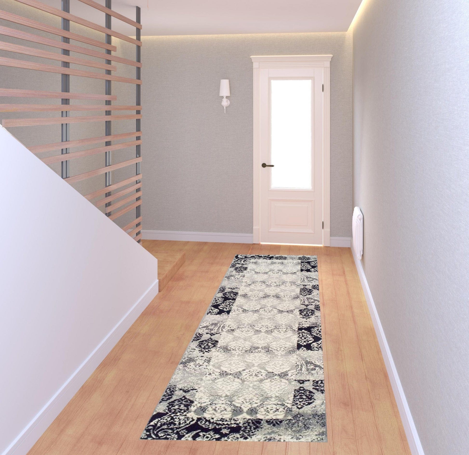 Add some artistry to your room with this 8' black and gray damask power loom distressed stain resistant runner rug. This runner shaped rug features a damask design in black and gray to give it visual interest. A classic shape marries with good looking design for your space This superior Turkish rug represents the highest quality and is built to last. Ideal for spaces with kids and pets, this rug is stain resistant to help repel stains and spilled liquids. Area Rugs help to give warmth and sense of home to your space. 0.31" H x 32.4" W x 96" D