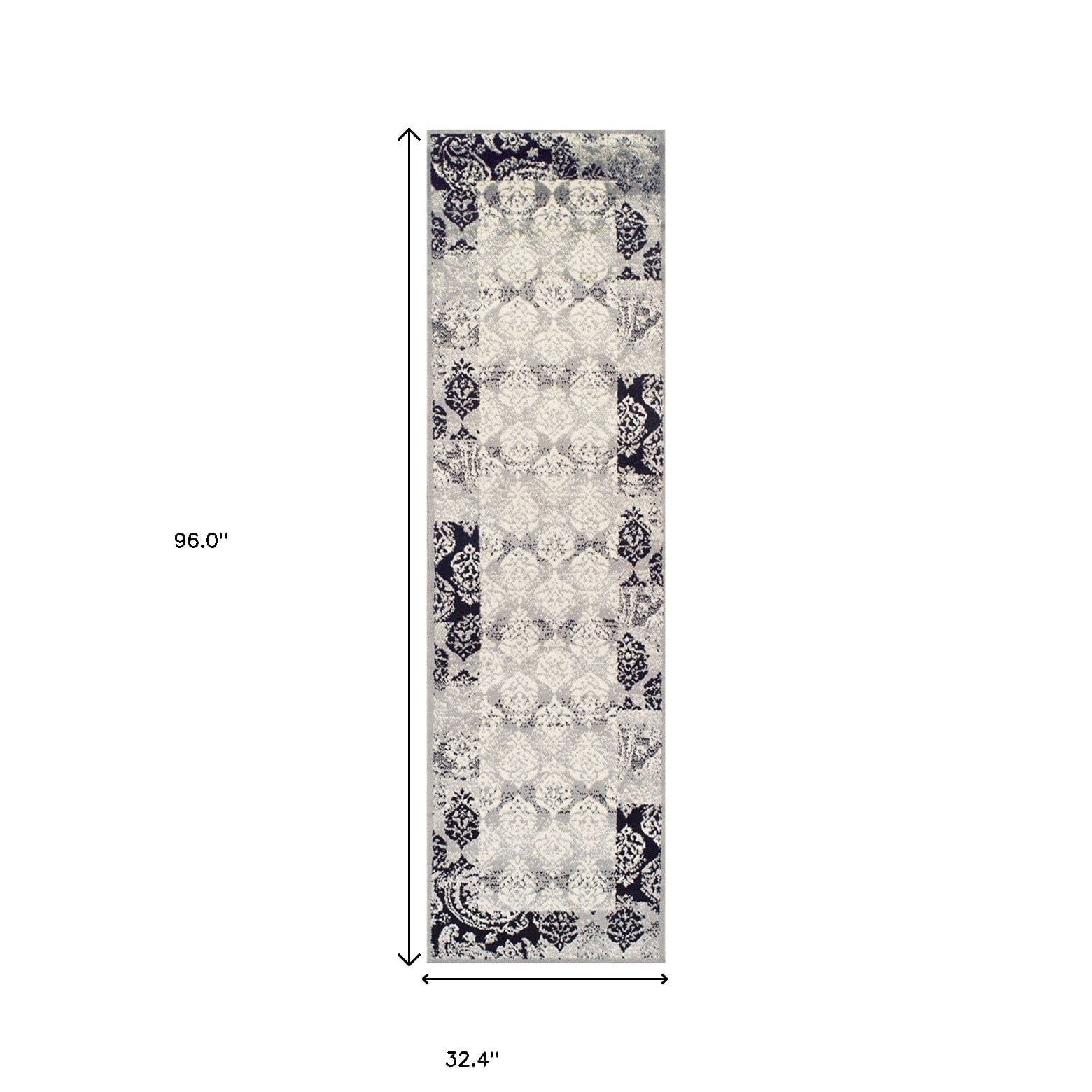 8' Black And Gray Damask Power Loom Distressed Stain Resistant Runner Rug