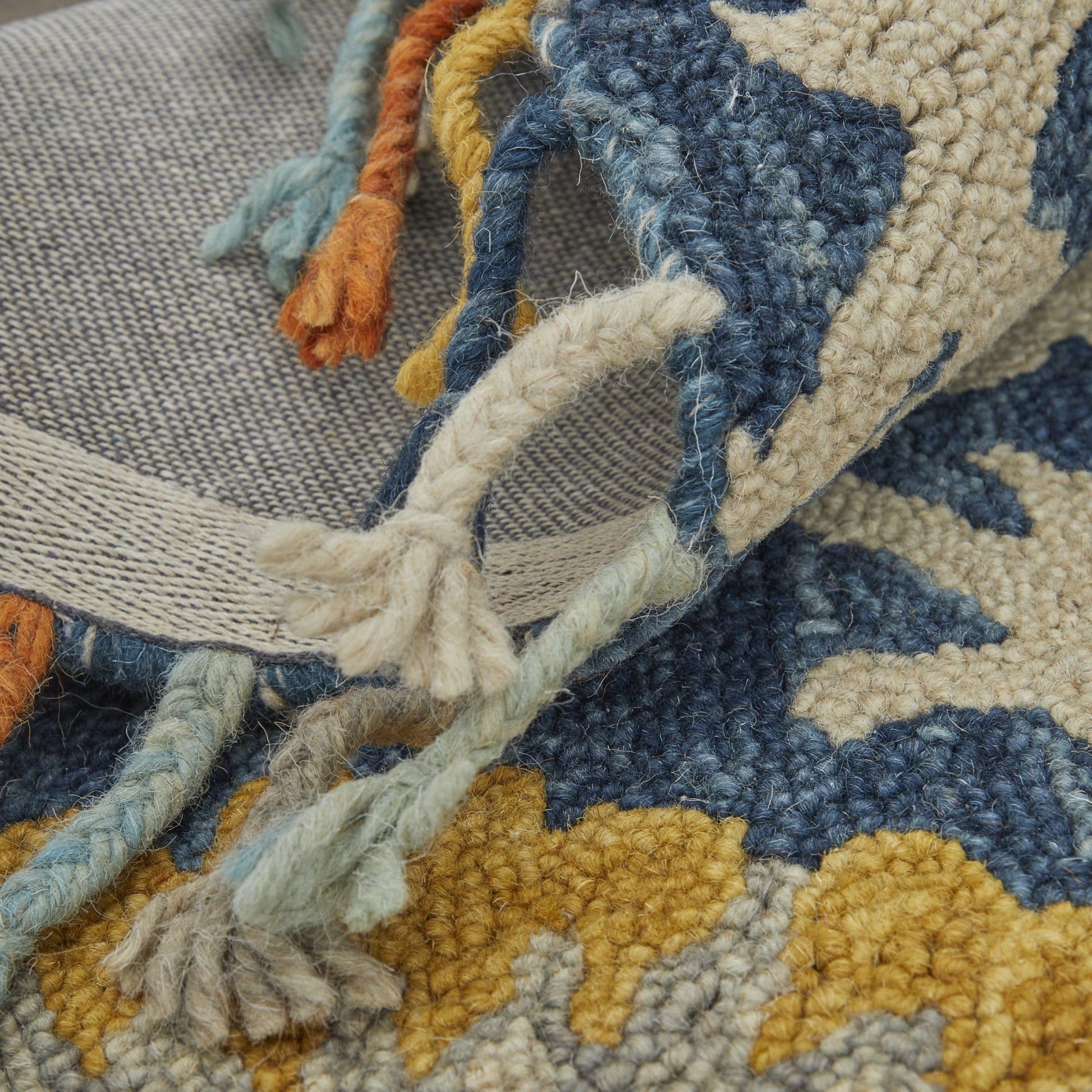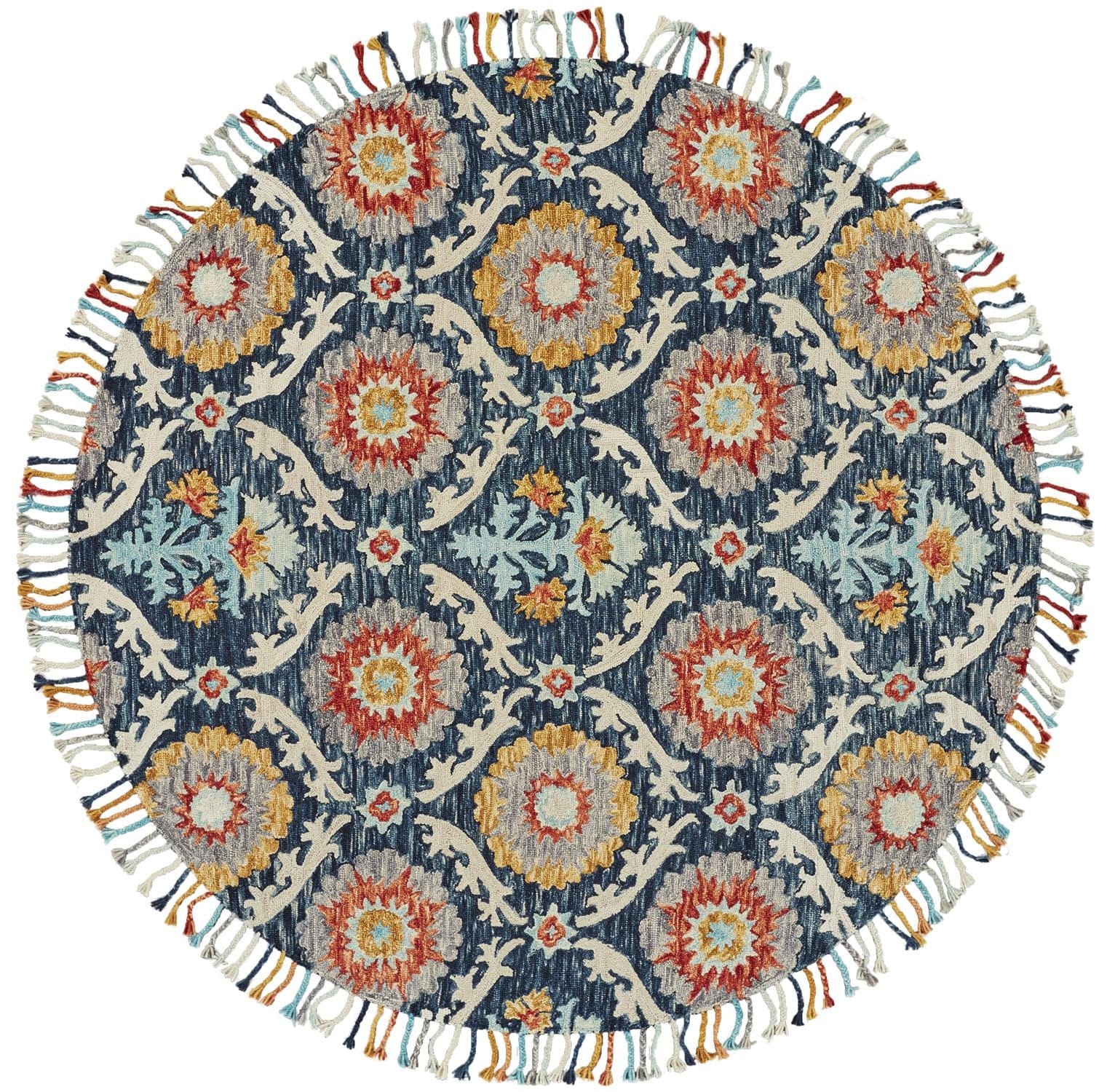 Set an inviting tone in your space with this 8' blue yellow and orange round wool paisley tufted handmade stain resistant area rug with fringe. This geometric round shaped rug features a paisley pattern in blue yellow and orange that combines a good looking print with a unique and updated shape. The mix of shape, color, and design gives this rug refreshing visual interest. Ideal for spaces with kids and pets, this rug is stain resistant to help repel stains and spilled liquids. Tassel ends bring a timeless and fashionable look to your interior. Place this area rug against a hardwood or tile floor and it will enliven your living space with style and sophistication. 0.24" H x 96" W x 96" D