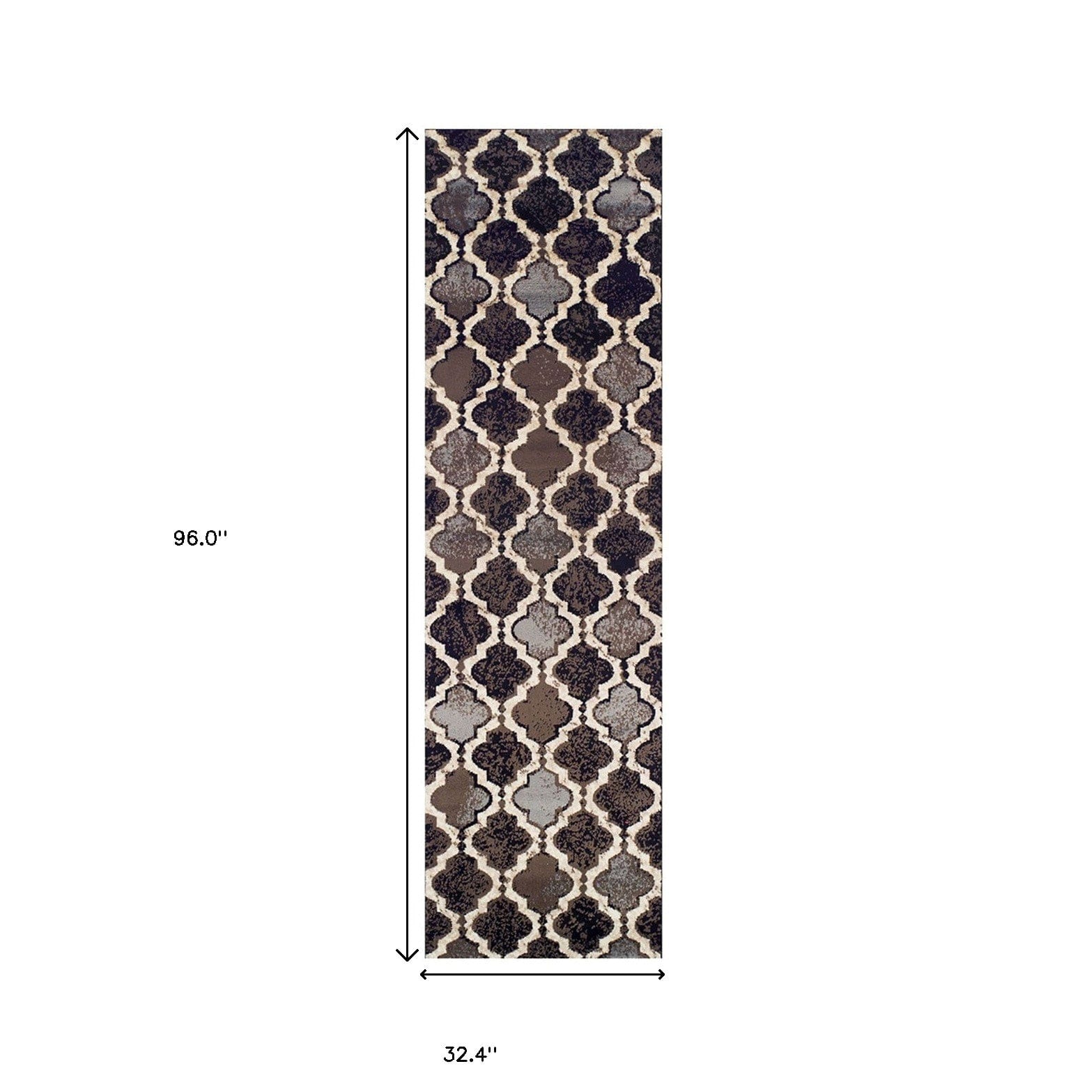 Add great coloration and comfortable texture to your space with this 8' chocolate quatrefoil power loom distressed stain resistant runner rug. This runner shaped rug features a quatrefoil design in chocolate to give it visual interest. A classic shape marries with good looking design for your space Made in Turkey, this rug offers high quality combined with good looking designer sensibilities. Ideal for spaces with kids and pets, this rug is stain resistant to help repel stains and spilled liquids. Area Rugs help to give warmth and sense of home to your space. 0.31" H x 32.4" W x 96" D