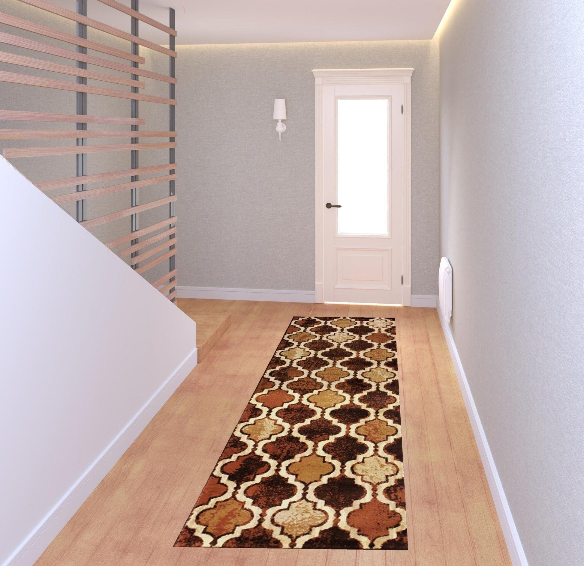 Add great coloration and comfortable texture to your space with this 8' coffee quatrefoil power loom distressed stain resistant runner rug. This runner shaped rug features a quatrefoil design in coffee to give it visual interest. A classic shape marries with good looking design for your space Made in Turkey, this rug offers high quality combined with good looking designer sensibilities. Ideal for spaces with kids and pets, this rug is stain resistant to help repel stains and spilled liquids. Area Rugs help to give warmth and sense of home to your space. 0.31" H x 32.4" W x 96" D