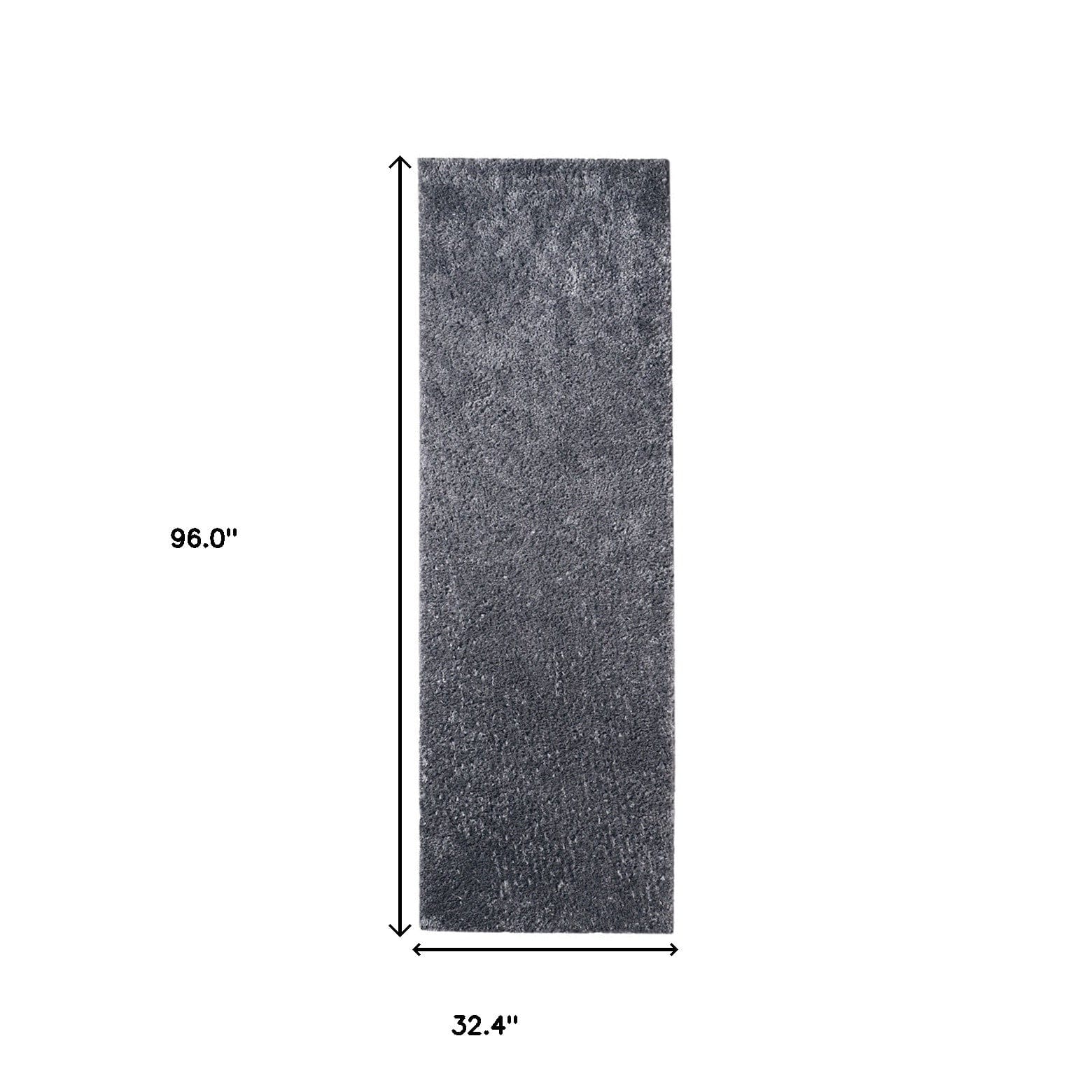 This 8' grey shag stain resistant runner rug, is a great way to add warmth to a room. This runner shaped rug flaunts a grey color that will be a great way to accent your space. Solid colors are versatile and will blend with any existing decor style. Ideal for spaces with kids and pets, this rug is stain resistant to help repel stains and spilled liquids. The retro shag construction of this luxurious rug will provide a soft and comfortable barrier to color tile and hardwood floors. Place this area rug against a hardwood or tile floor and it will enliven your living space with style and sophistication. 1.69" H x 32.4" W x 96" D