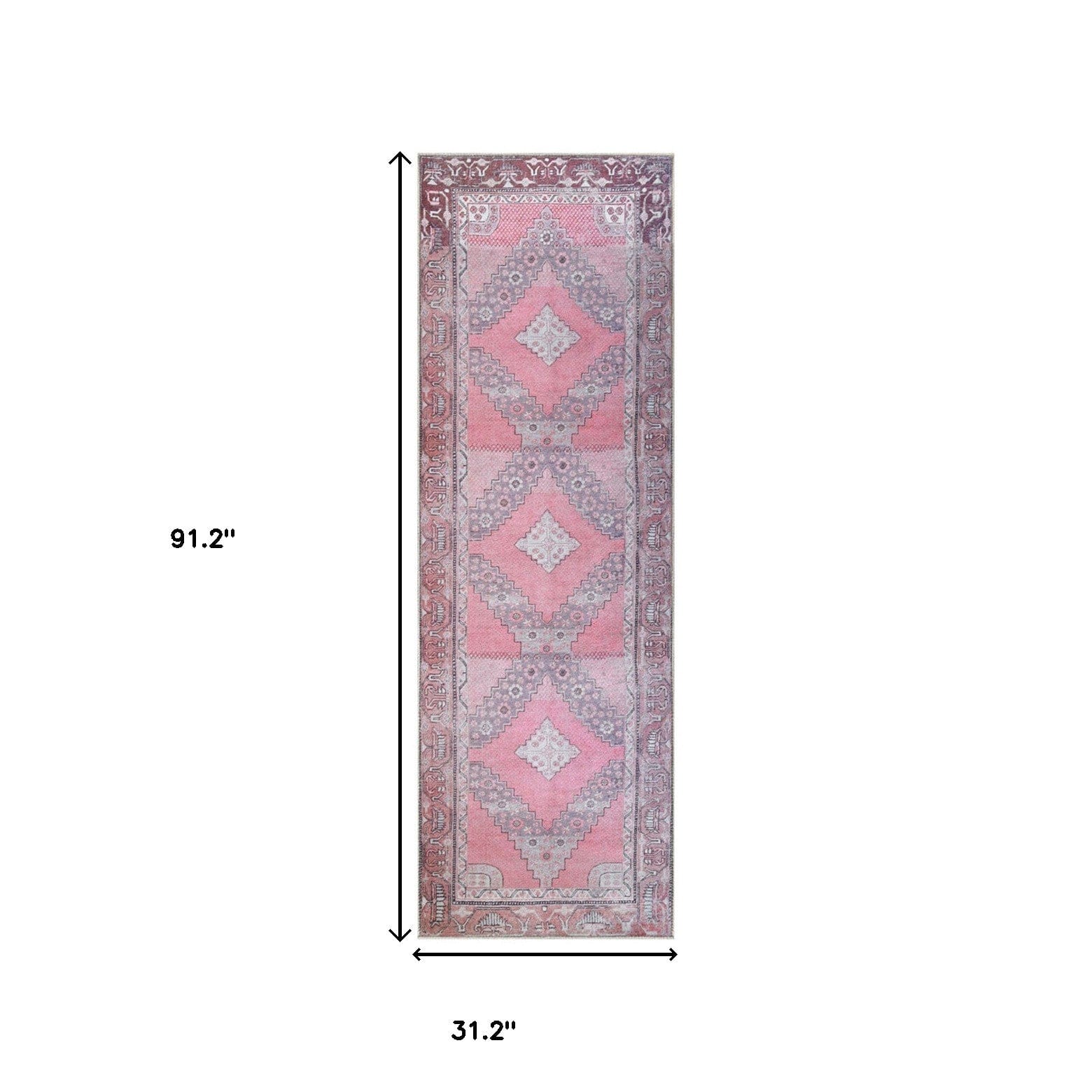 8' Pink Geometric Power Loom Distressed Stain Resistant Non Skid Runner Rug