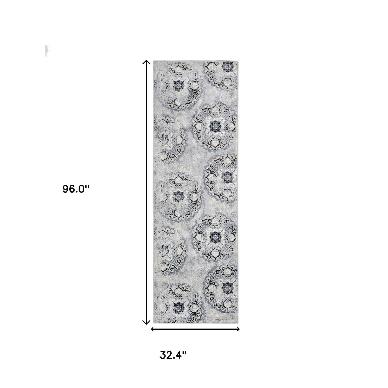 8' Silver And Gray Geometric Medallion Stain Resistant Runner Rug