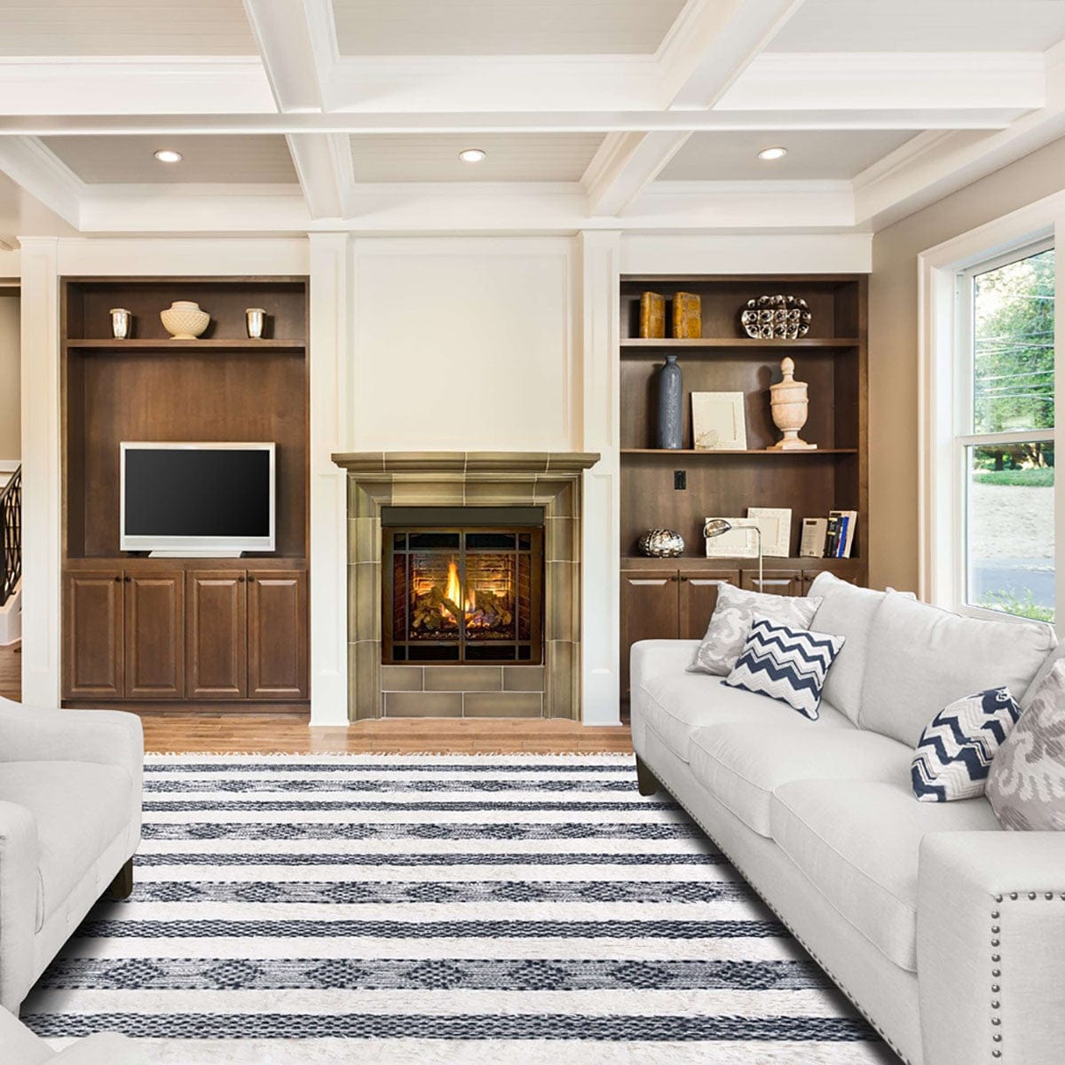 This 8' x 10' black and ivory wool striped flatweave handmade stain resistant area rug with fringe, is a great way to add warmth to a room. This rectangle shaped rug features a striped design in black and ivory to give it visual interest. A classic shape marries with good looking design for your space Made in Turkey, this rug offers high quality combined with good looking designer sensibilities. Ideal for spaces with kids and pets, this rug is stain resistant to help repel stains and spilled liquids. Tassel ends bring a timeless and fashionable look to your interior. Place this area rug against a hardwood or tile floor and it will enliven your living space with style and sophistication. 1.38" H x 96" W x 120" D