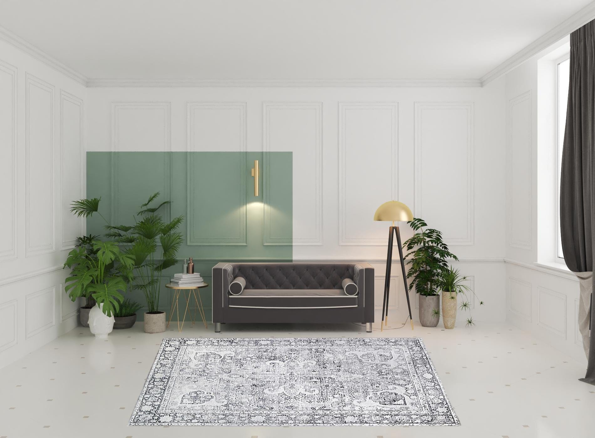 Add great coloration and comfortable texture to your space with this 8' x 10' charcoal medallion power loom stain resistant area rug. This rectangle shaped rug features a medallion design in charcoal to give it visual interest. A classic shape marries with good looking design for your space Made in Turkey, this rug offers high quality combined with good looking designer sensibilities. Ideal for spaces with kids and pets, this rug is stain resistant to help repel stains and spilled liquids. Place this area rug against a hardwood or tile floor and it will enliven your living space with style and sophistication. 0.08" H x 91.2" W x 115.2" D