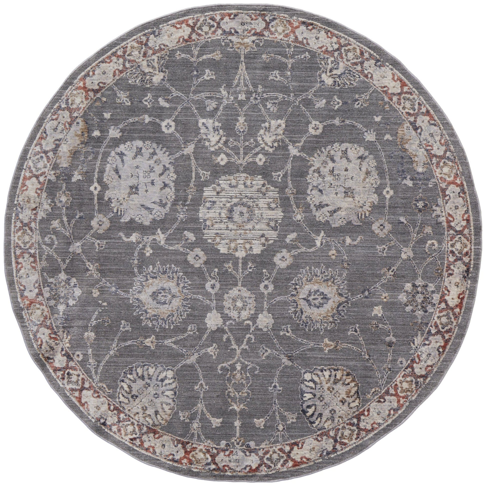 This 8' x 10' gray ivory and red floral power loom area rug, is a great way to add warmth to a room. This rectangle shaped rug features a floral design in gray ivory and red to give it visual interest. A classic shape marries with good looking design for your space Made in Turkey, this rug offers high quality combined with good looking designer sensibilities. Place this area rug against a hardwood or tile floor and it will enliven your living space with style and sophistication. 0.63" H x 94" W x 118" D