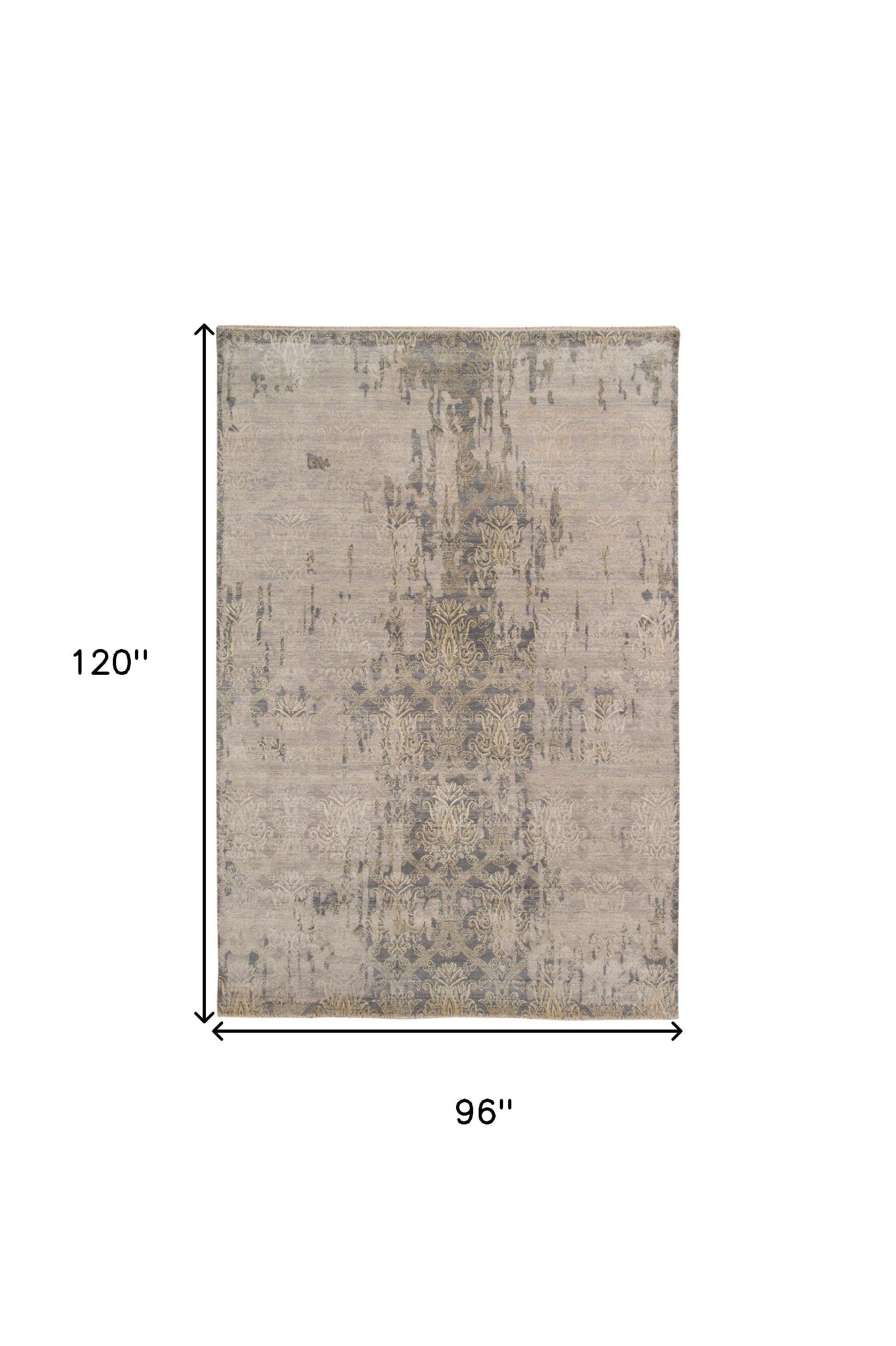 8' X 10' Gray Pearl New Zealand Lambs Wool Damask Distressed Area Rug With Fringe