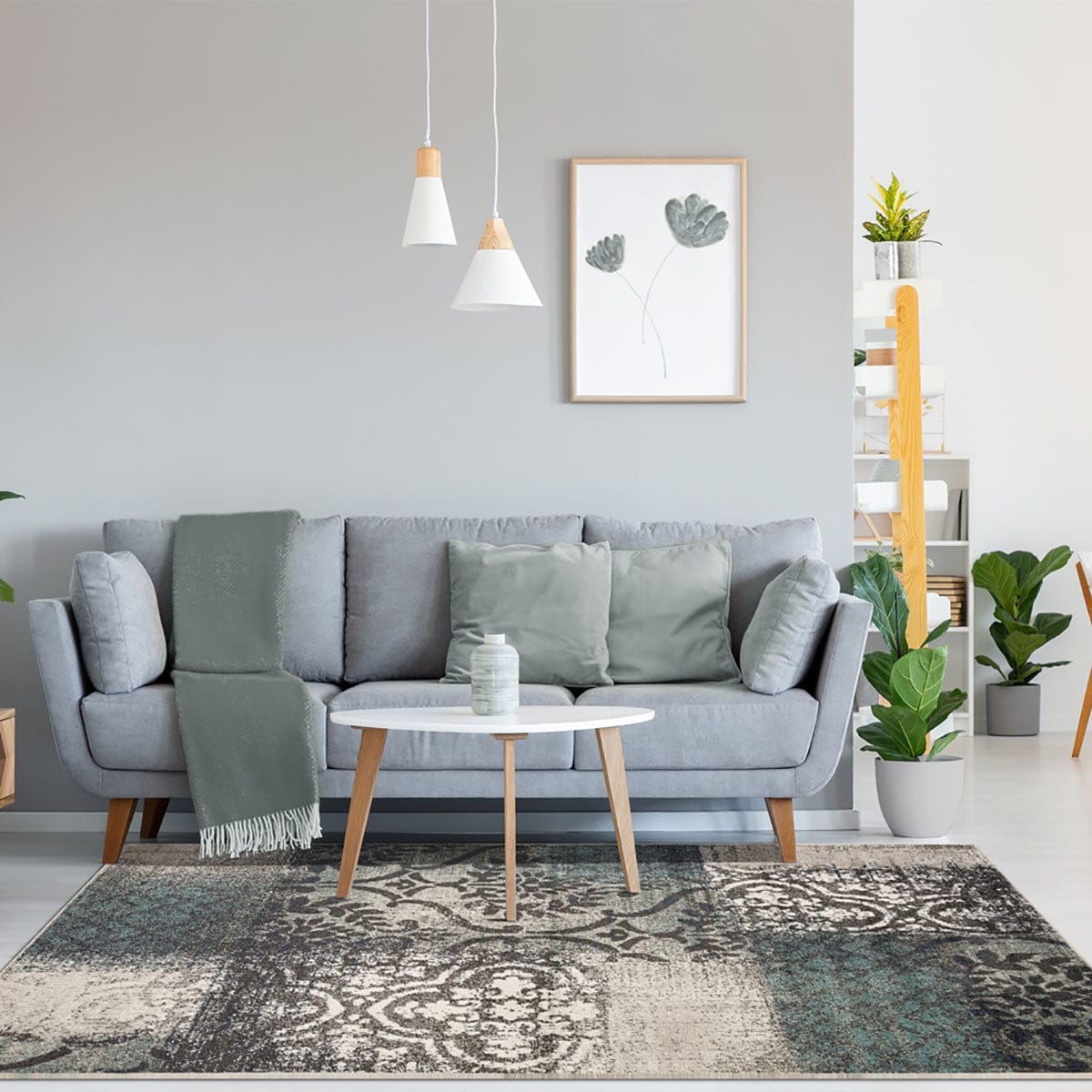 Set an inviting tone in your space with this 8' x 10' teal and gray damask distressed stain resistant area rug. This rectangle shaped rug features a damask design in teal and gray to give it visual interest. A classic shape marries with good looking design for your space Ideal for spaces with kids and pets, this rug is stain resistant to help repel stains and spilled liquids. Place this area rug against a hardwood or tile floor and it will enliven your living space with style and sophistication. 0.31" H x 96" W x 120" D