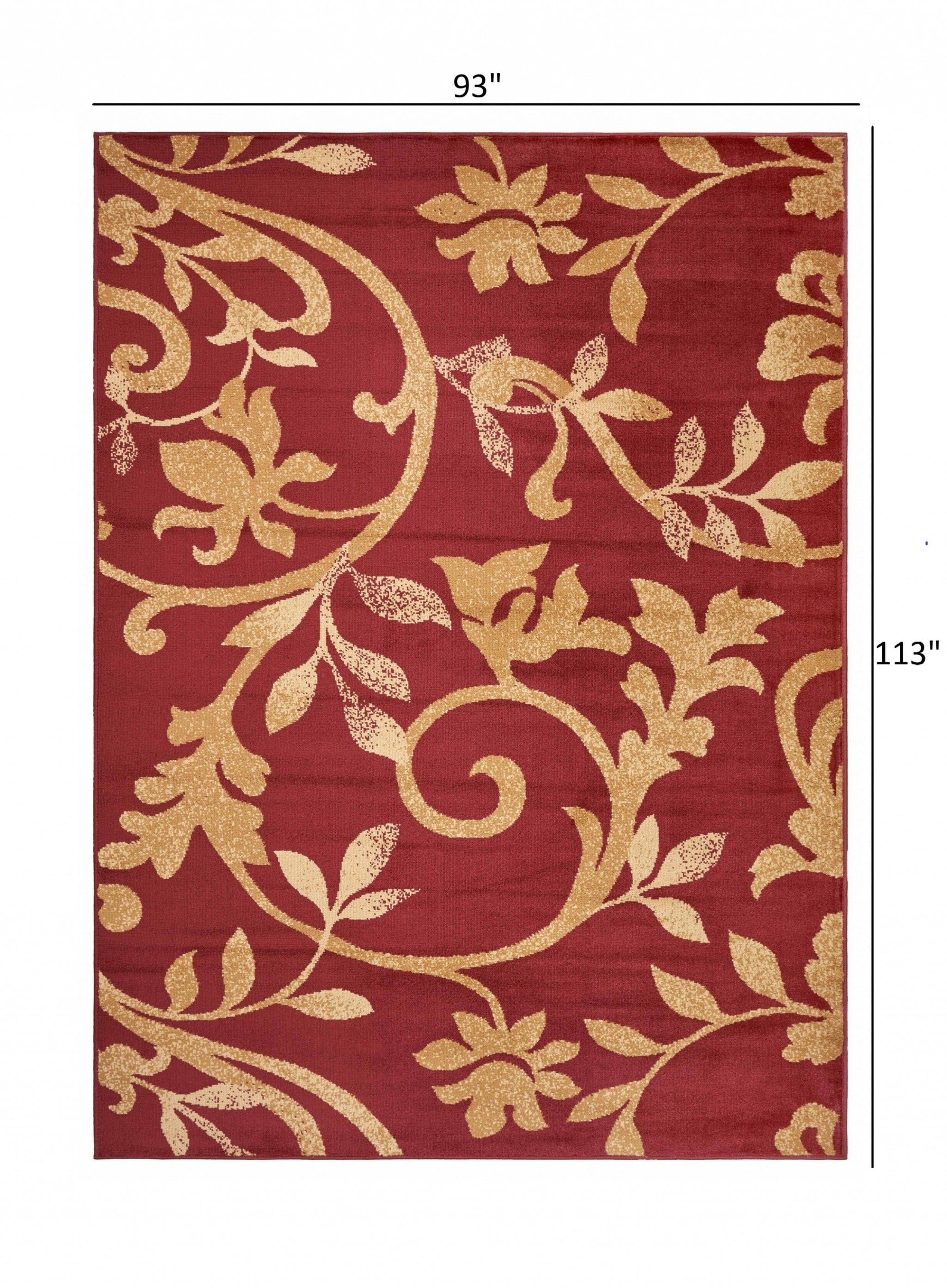 Beautifully designed in a gorgeous color palette, this Red Filigree Vines Area Rug is a visually captivating accent to grace your modern living space. The intricate filigree patterns in a beige-toned gradient look mesmerizing over the berry red backdrop. This Turkish-made rug is machine-made with sturdy olefin fibers in a low pile construction to offer a shiny, smooth surface that is durable enough to withstand indoor elements while ensuring fade and stain resistance to keep its sheen for long. With a vibrant palette that aligns with modern style and elegance, this area rug is bound to tie together the aesthetics of your contemporary living space. 93” x 113” x 0.4”