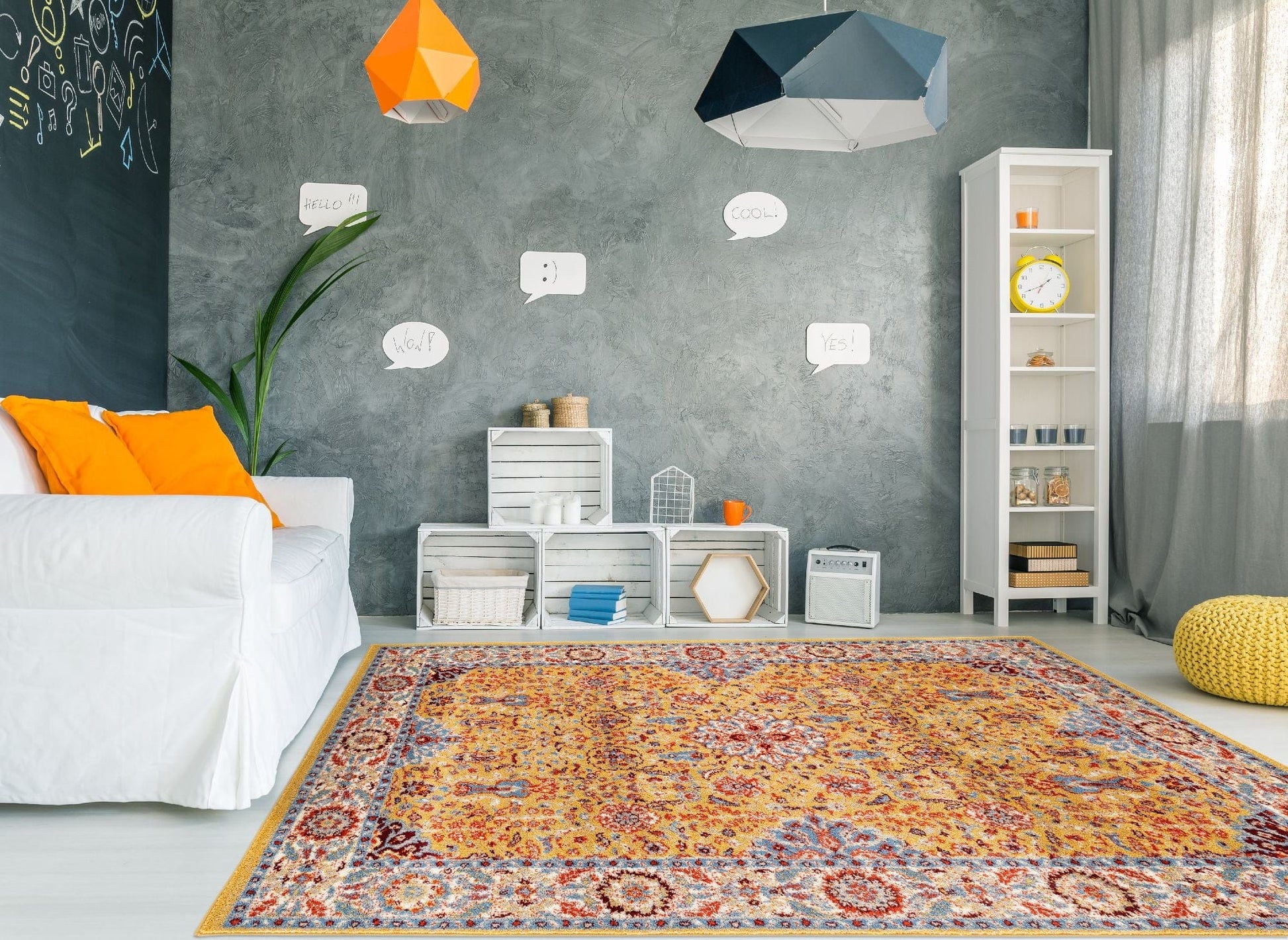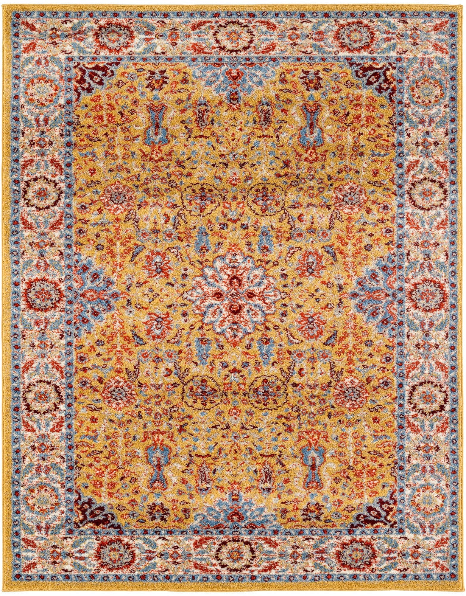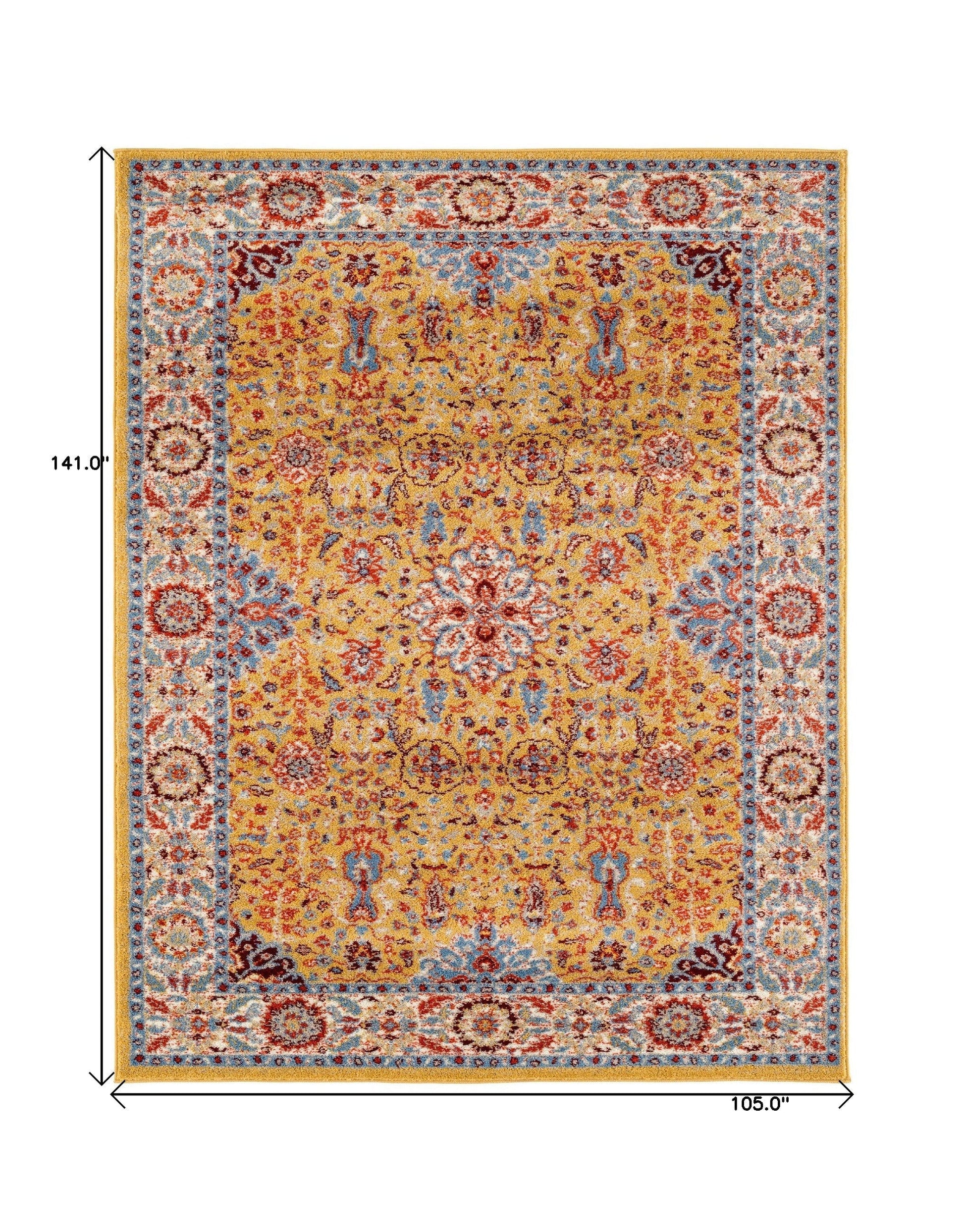 Add some artistry to your room with this 9' x 12' blue yellow and ivory oriental stain resistant area rug. This rectangle shaped rug features a oriental design in blue yellow and ivory to give it visual interest. A classic shape marries with good looking design for your space This superior Turkish rug represents the highest quality and is built to last. Ideal for spaces with kids and pets, this rug is stain resistant to help repel stains and spilled liquids. Area Rugs help to give warmth and sense of home to your space. 0.38" H x 105" W x 141" D