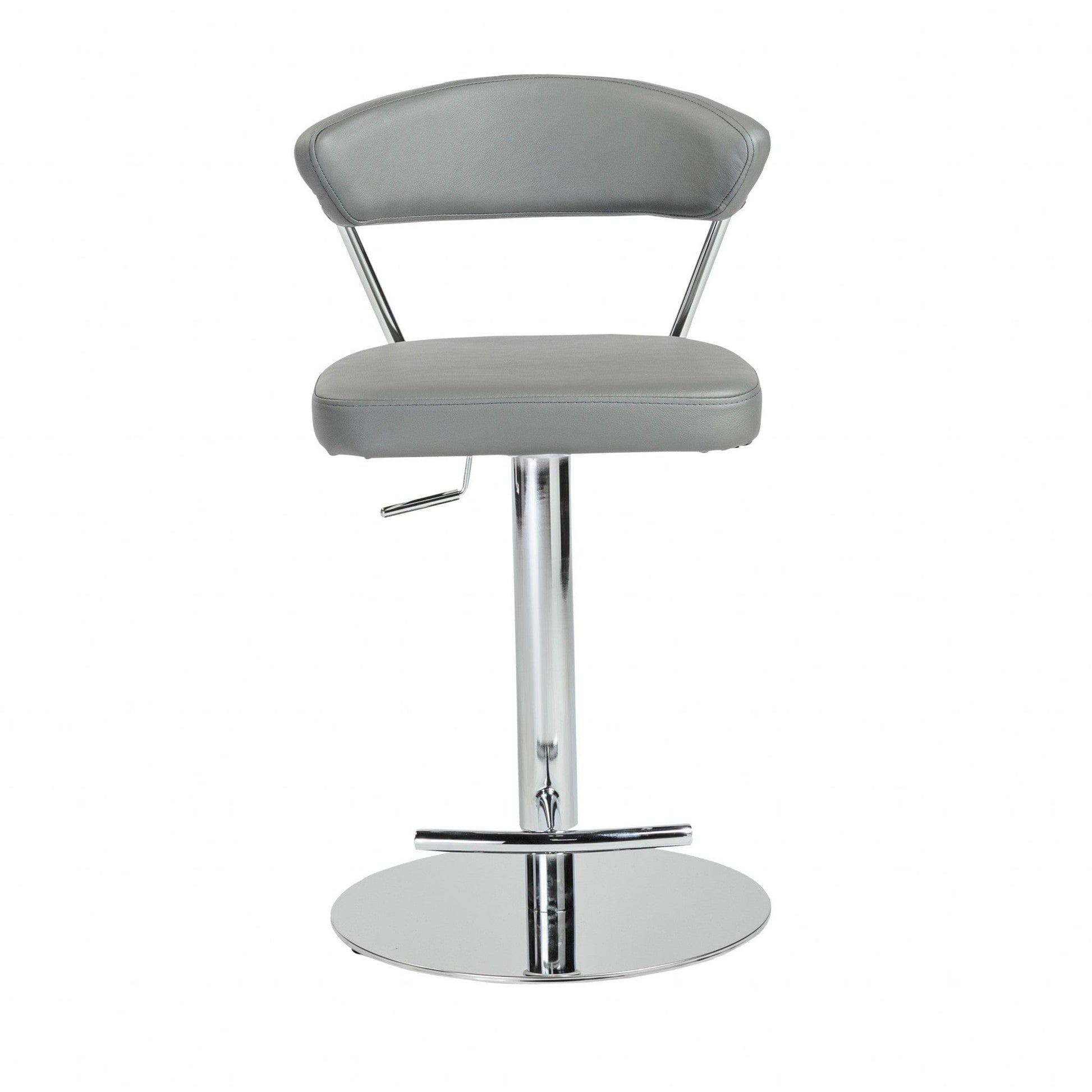 The perfect way to add design and utility to your home, this Adjustable Gray Swivel Stool will elevate the look of any space. The base of the stool is made from aluminum and is finished to a silver color. The rounded stabilizing base has a metal rube coming up from it that attaches to the base of the seat. There is a curved footrest attached to the metal tube as well. The seat has a simple shape and is covered in a gray leather fabric. The back is made of two aluminum rods that attach to a curved gray leather covered part. This stool is adjustable and can be used as a counter stool or a bar stool. This stool has a very contemporary feel to it and will look great with any colors or interior style you have. 42.13" H x 19.3" W x 19.69" D