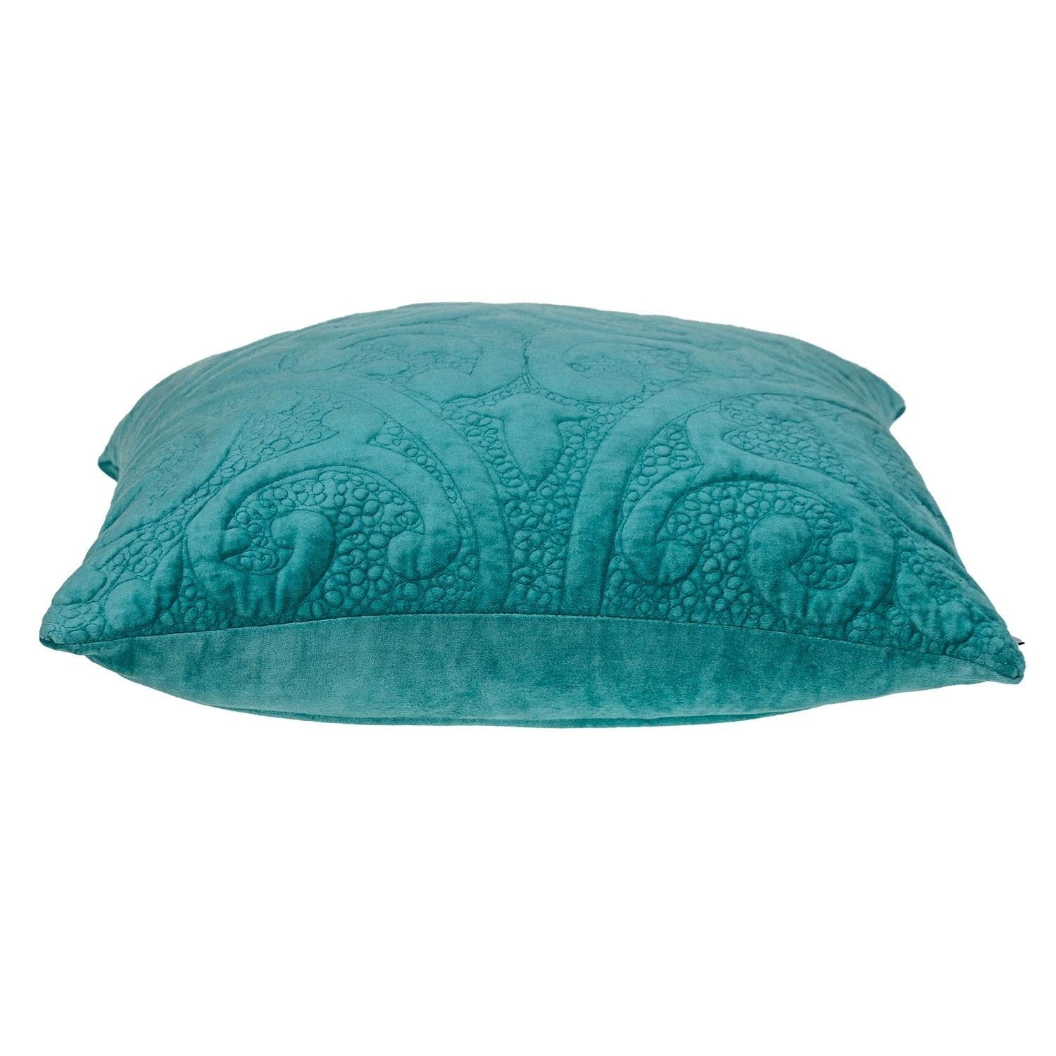 Amplify the magnificence of your décor with the Aqua Quilted Velvet Square Throw Pillow. Featuring an opulent geometric blend of 3D like patterns, the pillow is super soft and portrays a grandeur classic presence. Interweaved to perfection the cotton and velvet fused pillow has an original perspective and can highlight, add a touch of luxury to any room. A hidden zipper flap is provided for easy cleaning and maintenance. Bring some character and a splash of color into your home with the square throw pillow that is generously sized to make your sofa, chair or bedroom more pleasant and cozy. 20" x 20" x 4"