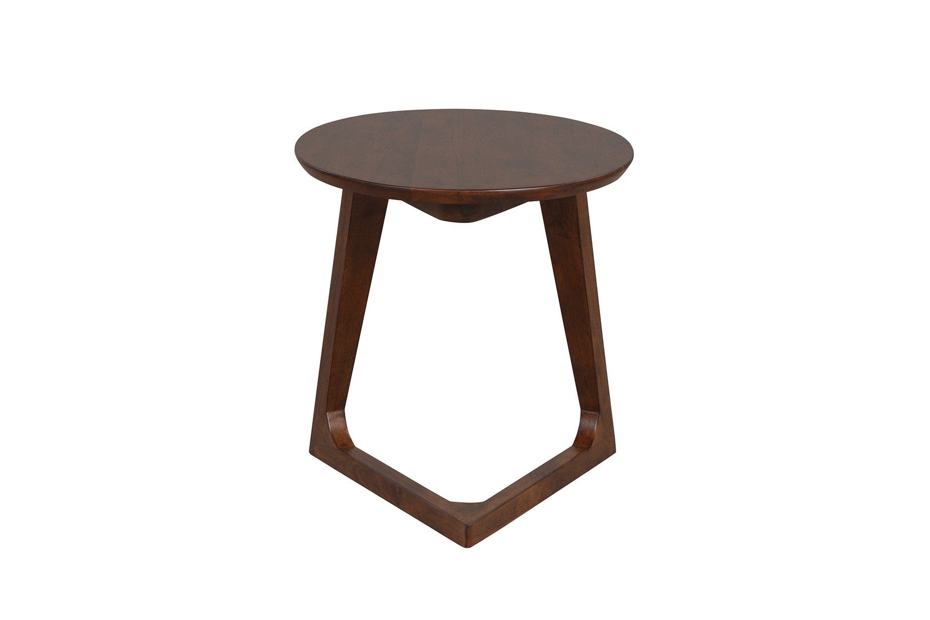 This Asymmetric Mocha Wood End Table has a stylish modern rustic aura that makes it the perfect end or snack table for your living or dining room. Made from quality wood and colored in a beautiful mocha color, this stylish piece is strong, sturdy, and good looking. The table top surface is round, ideal for displaying your lamp, small potted plants, picture frames, or using to hold your drinks. It is supported by a single asymmetric v-shaped leg that adds unique dimension and a contemporary vibe. 20” x 18” x 20”