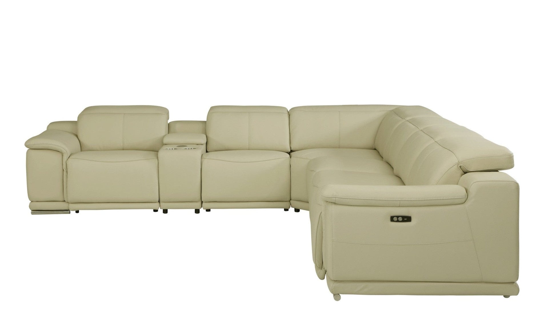 Beige Italian Leather Power Recline L Shape Seven Piece Corner Sectional With Console