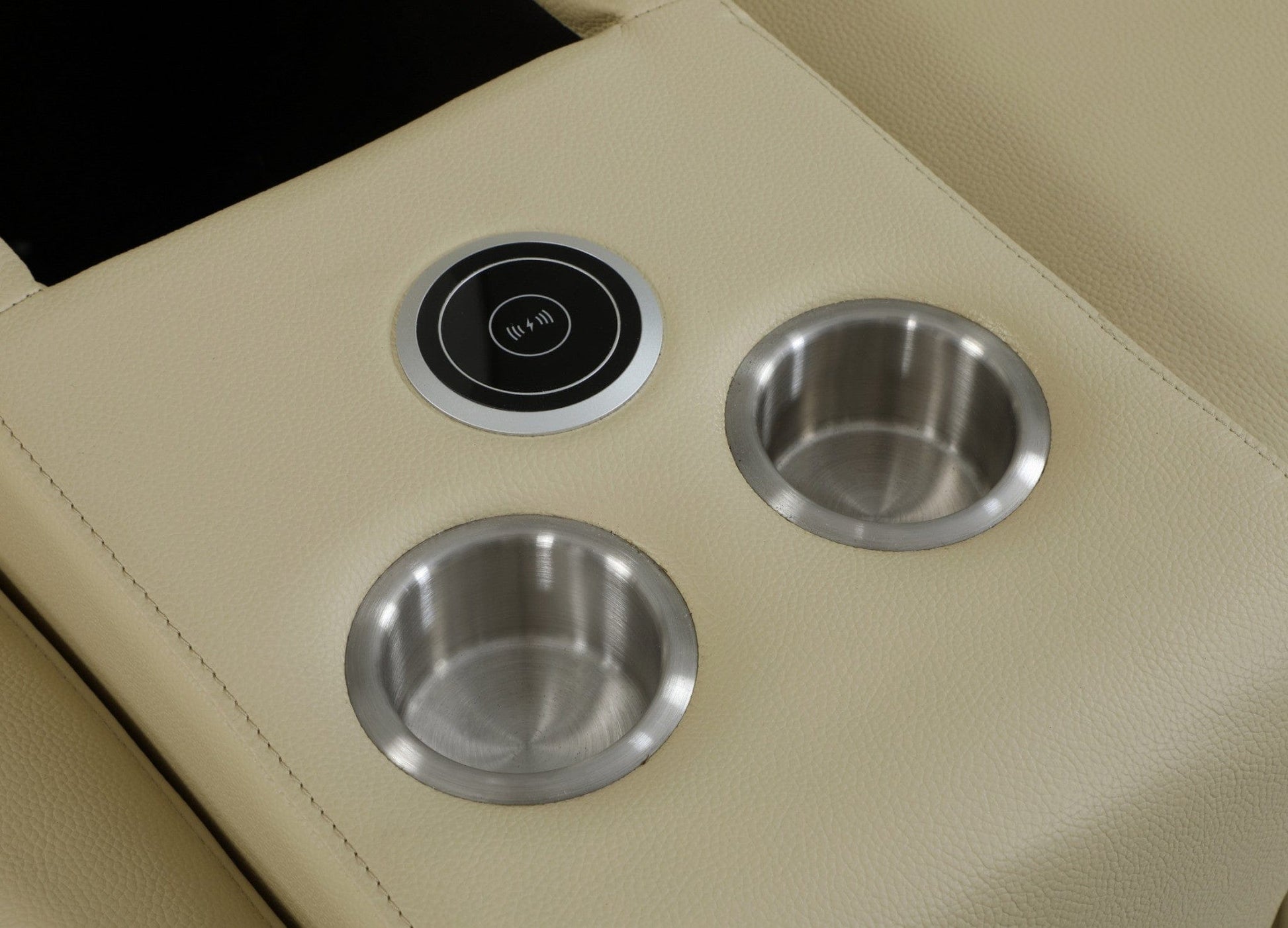 Take your relaxation to the next level with this super soft and comfortable beige italian leather power reclining l shaped seven piece corner sectional with console. The high-end premium leather used makes your lounging luxuriously comfortable and adds an elegant appeal to your space. Square arms offer a comfy place to rest. For the ultimate in relaxation, this sectional includes power - push button recline that turns it into a comfy lounge for sleeping or resting. Chrome metal legs effortlessly elevate the room and add a touch of contemporary design. L-Shape sectionals are a perfect way to optimize seating choices without cluttering the room or breaking up the space you have. Features console storage for convenience and to help keep your space tidy. A great showpiece for your room, this sectional is a must have. 35" H x 123" W x 138" D