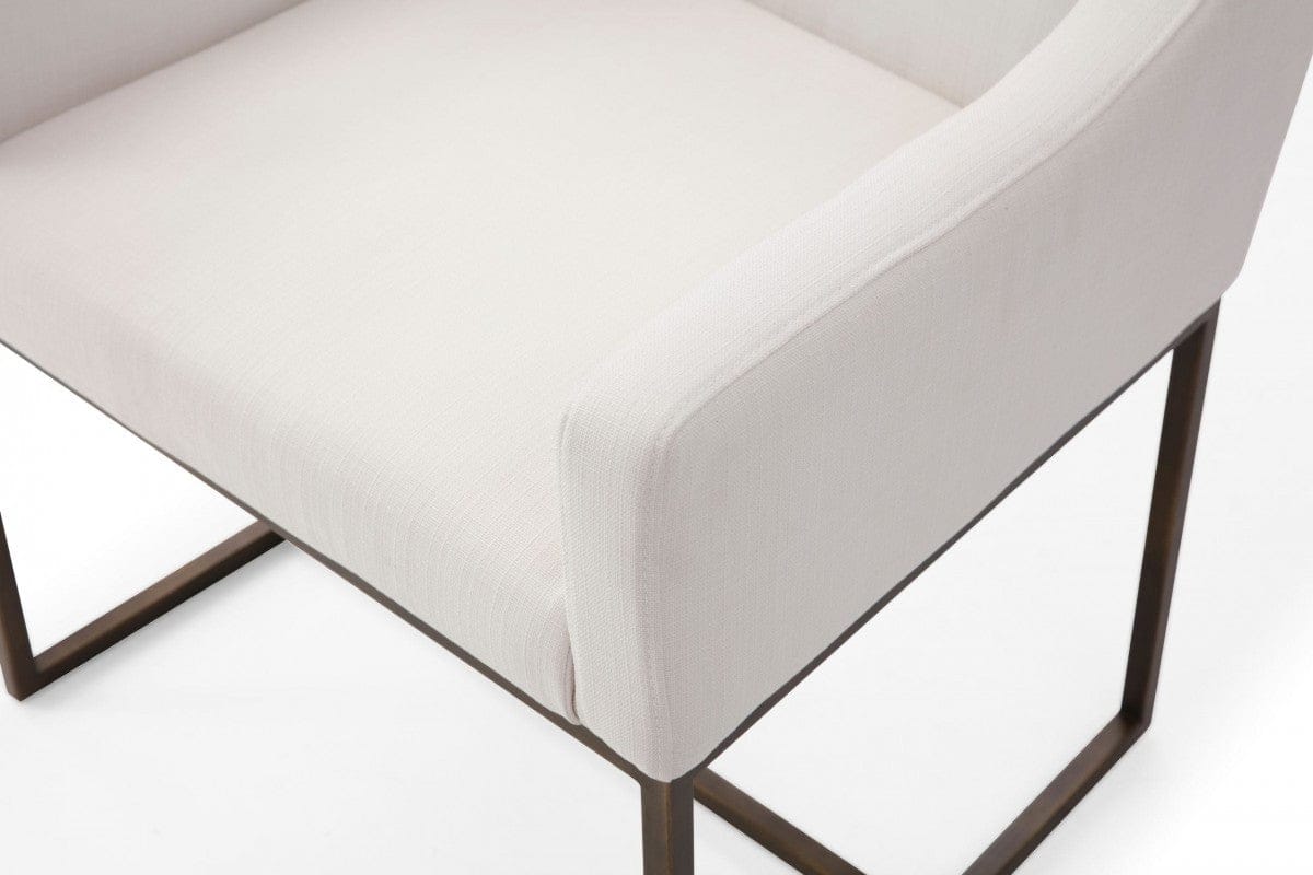 Bold and super elegant, the Beige Velvet Antique Brass Dining Chair is a unique dining chair that will bring retro-modern charm into your dining room. With its perfect backrest height, sloped armrests, and covered in stain-resistant velvet over a layer of dense foam padding it offers a premium seating experience. The sturdy metal base comes in an elegant brushed brass finish. 30.7" H x 24" W x 24" D