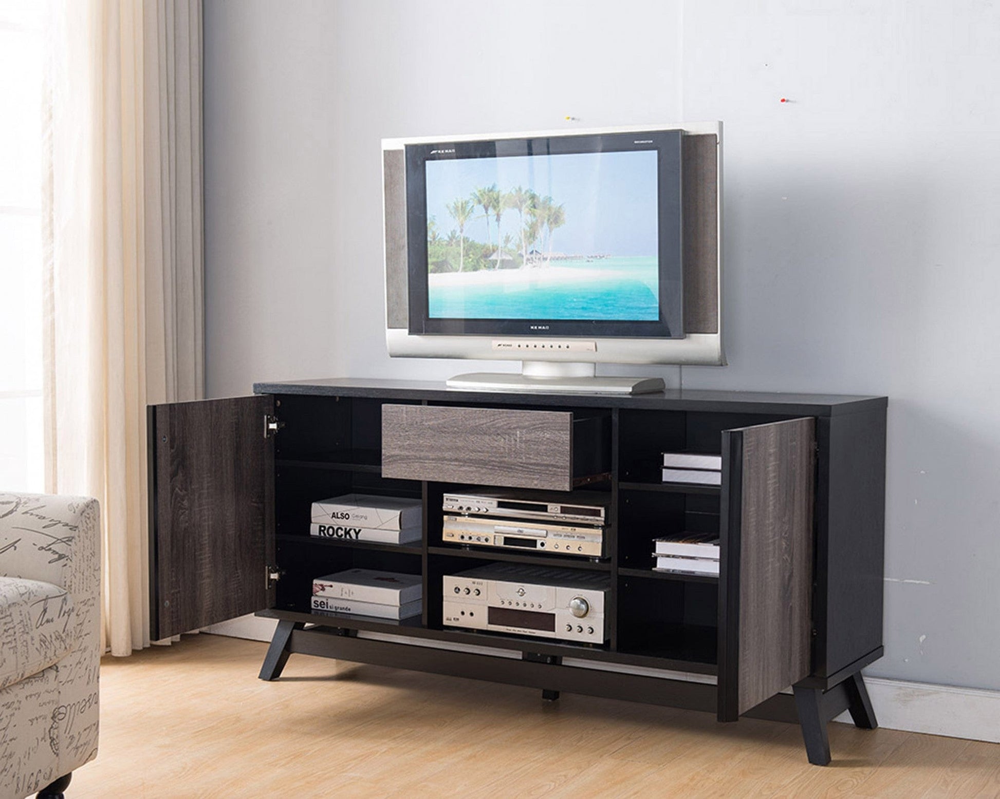 Create the modern aesthetic appeal and enhance the relaxing comfort of your home entertainment complex with this Black and Distressed Gray TV Console. The black and distressed gray gives a perfect color combination and matches the modern design style, which visually gives a sophisticated and balanced feel to your space. Its versatile wide-top surface design provides a scratch-resistant and safe place to accommodate even large-size LED TVs, together with all your home entertainment systems, or kitchen essentials. The central sliding drawer with two-open center shelves, and door panels on both ends with three interior shelves, all of these can be a versatile way to accommodate all your home entertainment systems, such as your Blu-ray player, audio sound system, or even kitchenware. It also features to allow you to organize excess cords or cable wires and help your place look tidy with a luxury modern feel. Crafted from durable particleboard which is perfectly designed to resist moisture and humidity with the sturdy design legs, all to provide a tough piece of furniture that will last. Create a make-over to your living space and add a luxury feel and happy vibes with this functional piece to help you organize all your home entertainment components or as a console piece that is stylish and elegant at the same time. 30” X 60” X 15.50”