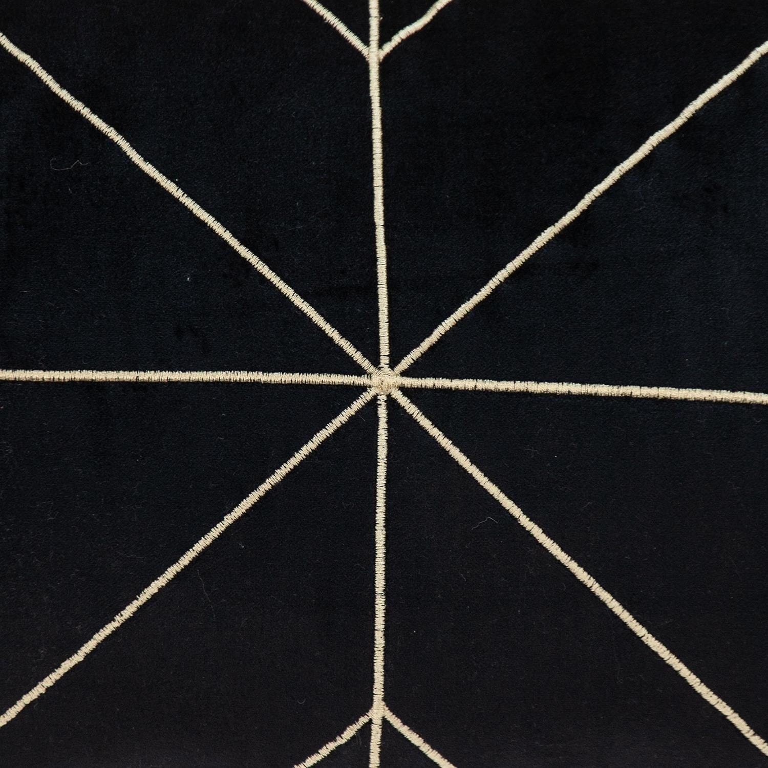 Luxury meets simplicity with the Black and Gold Geo Velvet Lumbar Pillow with Gold Tassels. Beautifully handcrafted from an all velvet base, the pillow gracefully evokes a sense of charm and brings forth a little drama into your diverse space. Fascinating gold geometric patterns stitched on the soft velvet leaves a mesmerizing effect while adding character to your room. Four gold tassels adorn the four corners of the pillow that enhance the plush level. Concealed on the back is a hidden zipper under a neatly designed flap, provided for easy cleaning and removal. Enliven your home by pairing this pillow with your favorite pastel shaded decors. 12" x 24" x 4"