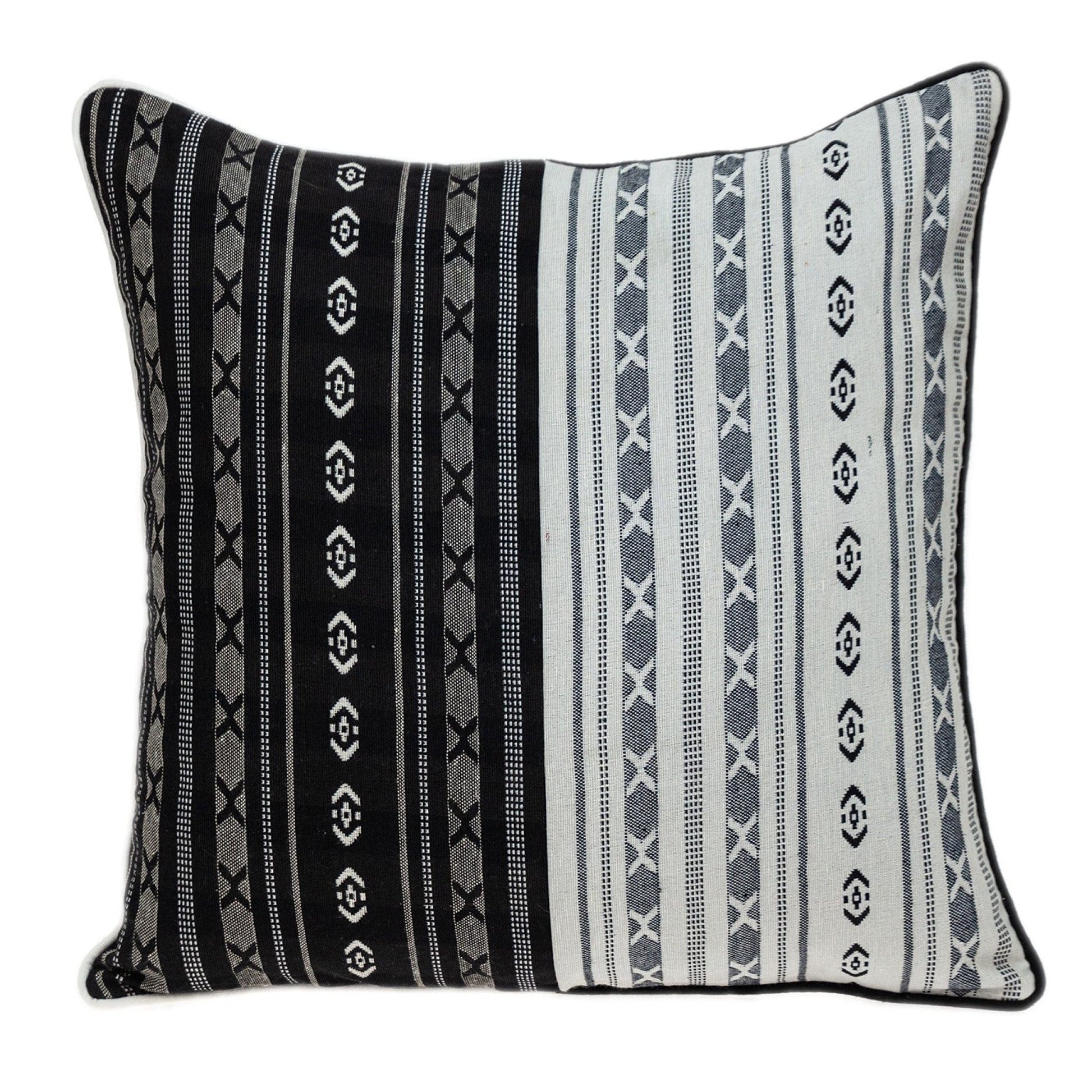 A beautiful example of a trendy and versatile design, the Black and White Abstract Accent Pillow is the only thing you need to add a modern element to your living space. Made of 100% cotton, this pillow features an abstract design on a half-black and half-white front, and the patterns on it deliver a rustic feel. There is a zipper closure on the back and the pillow needs to be dry cleaned or spot cleaned. 20” x 20” x 5”