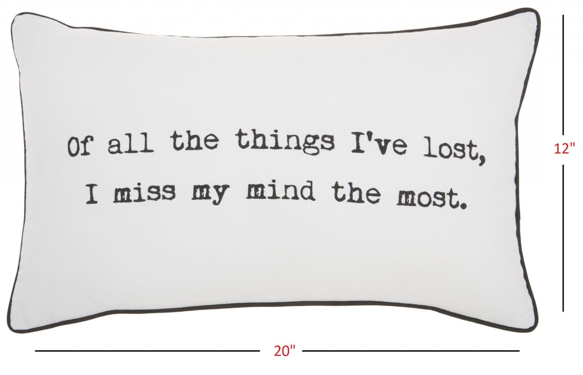Show off your humorous side in a welcoming way with this modern yet retro Black and White I Miss My Mind Throw Pillow. The fun type face print quotes "of all the things I've lost, I miss my mind the most.", in black on a white background and trimmed with black piping all around, making this a great transitional accent pillow that blends with multiple decor styles. The whole pillow is made with 100% polyester to ensure your message remains in sight for years to come. Add a unique and whimsical expression to your space with this simply stated yet fabulous accent. 12” x 20” x 5"