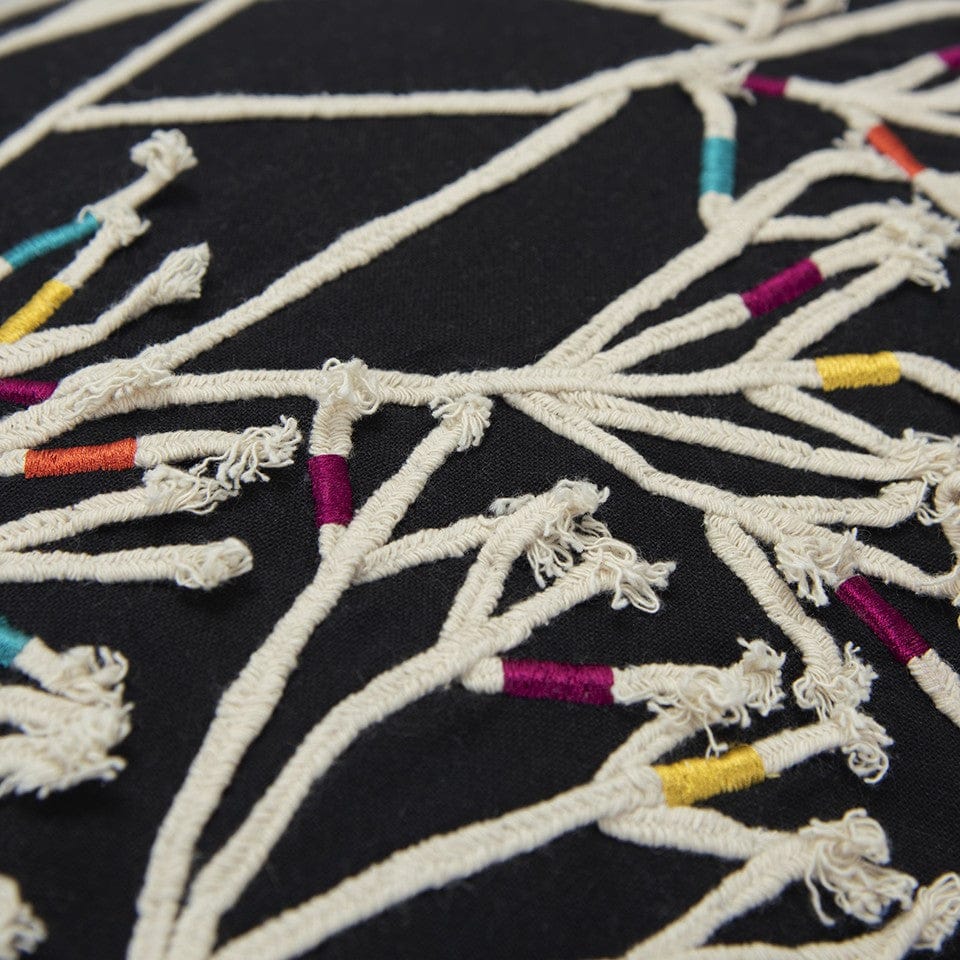 The eye-catching beauty of this Black Cream Impressionistic Branch Throw Pillow is sure to draw the attention of the guests to your living space. The creatively designed cotton cord branches in cream create a stunning contrast over the black background, giving the pillow an abstract botanical flair. The embroidered bands in warm shades of orange, red, teal, and yellow accentuate a tribal influence while the frayed cord ends add dimension and texture to this decorative pillow. Crafted from high-quality cotton fabric to ensure long-lasting durability without losing its pristine look. The pillow features matching cotton back with a hidden zipper closure for convenience and the clean knife edging makes this pillow an ideal fit for modern or casual homes. If you want a unique addition to your living space, look no further than this exclusive decorative pillow. 20” x 20” x 6.25”