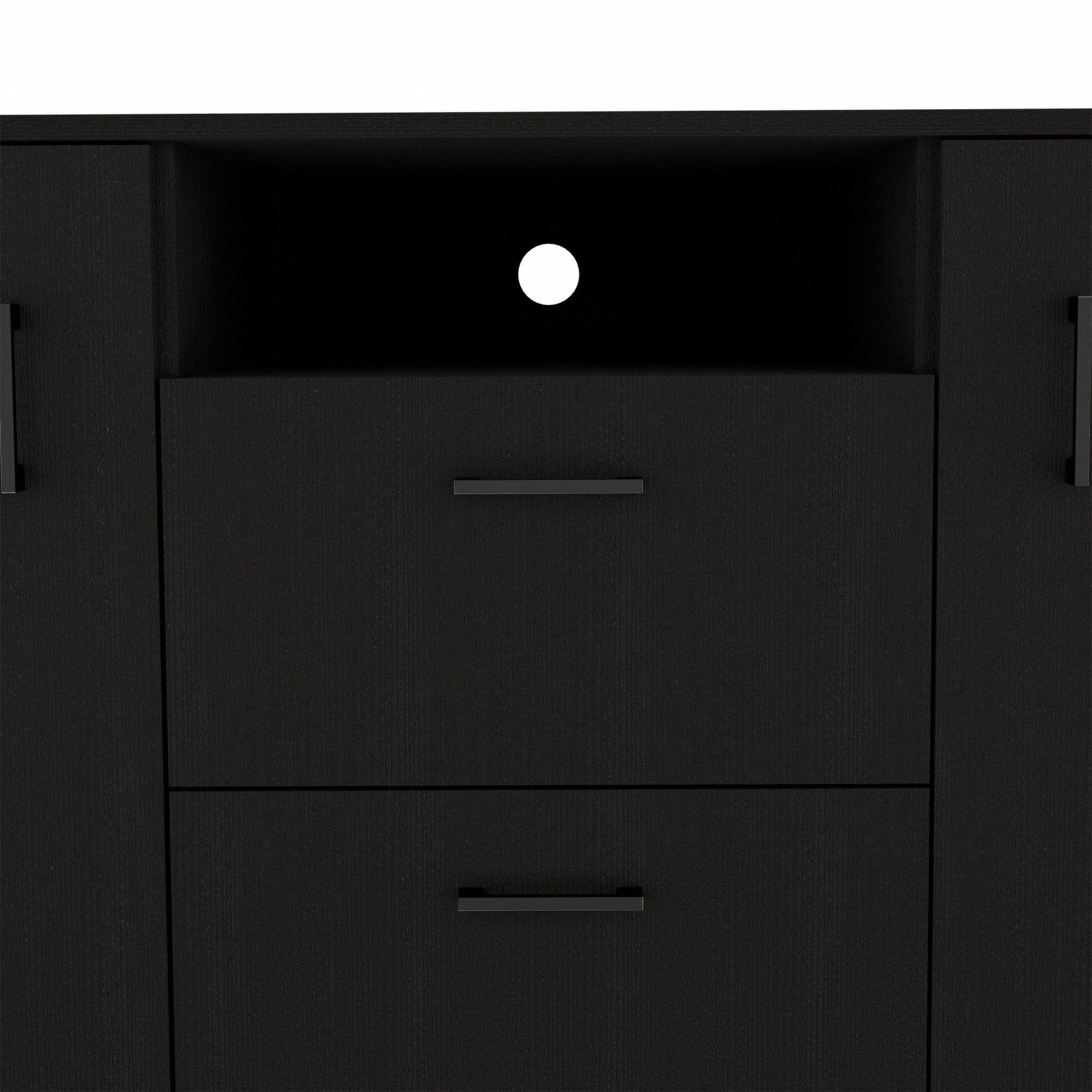 Bring this luxury piece into your interior design to be more organized and let the energy vibe increase in your space, with this Black Three Door Closet with Two Drawers, and enhance your room into a visually delightful and highly functional one. The black color visually defines a sophisticated feel and produces consistency with other colors or designs in your house. This closet design is exquisitely colored in deep black inside and out to outline the modern closet style of this piece. This wardrobe closet features a one-door cabinet with a hanging rod for your ironed clothes, another one-door cabinet with four spacious interior shelves, an open center shelf, two sliding drawers with full metal rails, and comes with a bottom one-door cabinet with two interior shelves for your folded clothes or footwear, all of these makes this a perfect closet shelving for all kinds of apparel. This closet organizer is crafted from durable particleboard which is perfectly designed to resist moisture and humidity, to provide a tough piece that will last. Add more comfort and luxury vibe into your interior design with this savvy yet stylish closet, to optimize its storage capacity so you can enjoy a fully organize place, that can bring more energy feel with an uncluttered space. 48” X 55.10” X 20.20”
