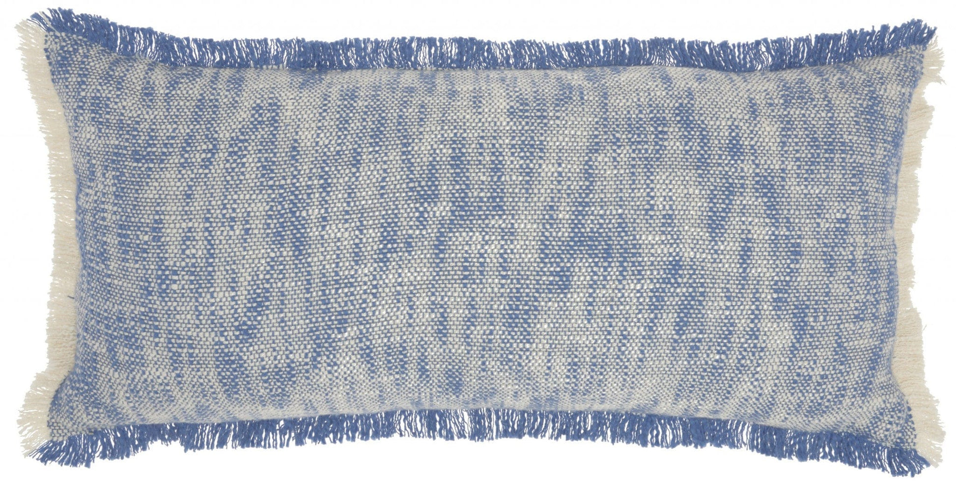 Add some beautiful color and style to your sofa, bed, or favorite chair with this dreamy Blue and White Woven Heathered Lumbar Throw Pillow. A gorgeous weave that blends color with a creamy ivory and is lightly textured. There is frayed fringe all around the edges that alternates between color and ivory giving this pillow a unique and designer look. Generous in size this pillow is a great option for stylish low back support. 14" x 30" x 5"