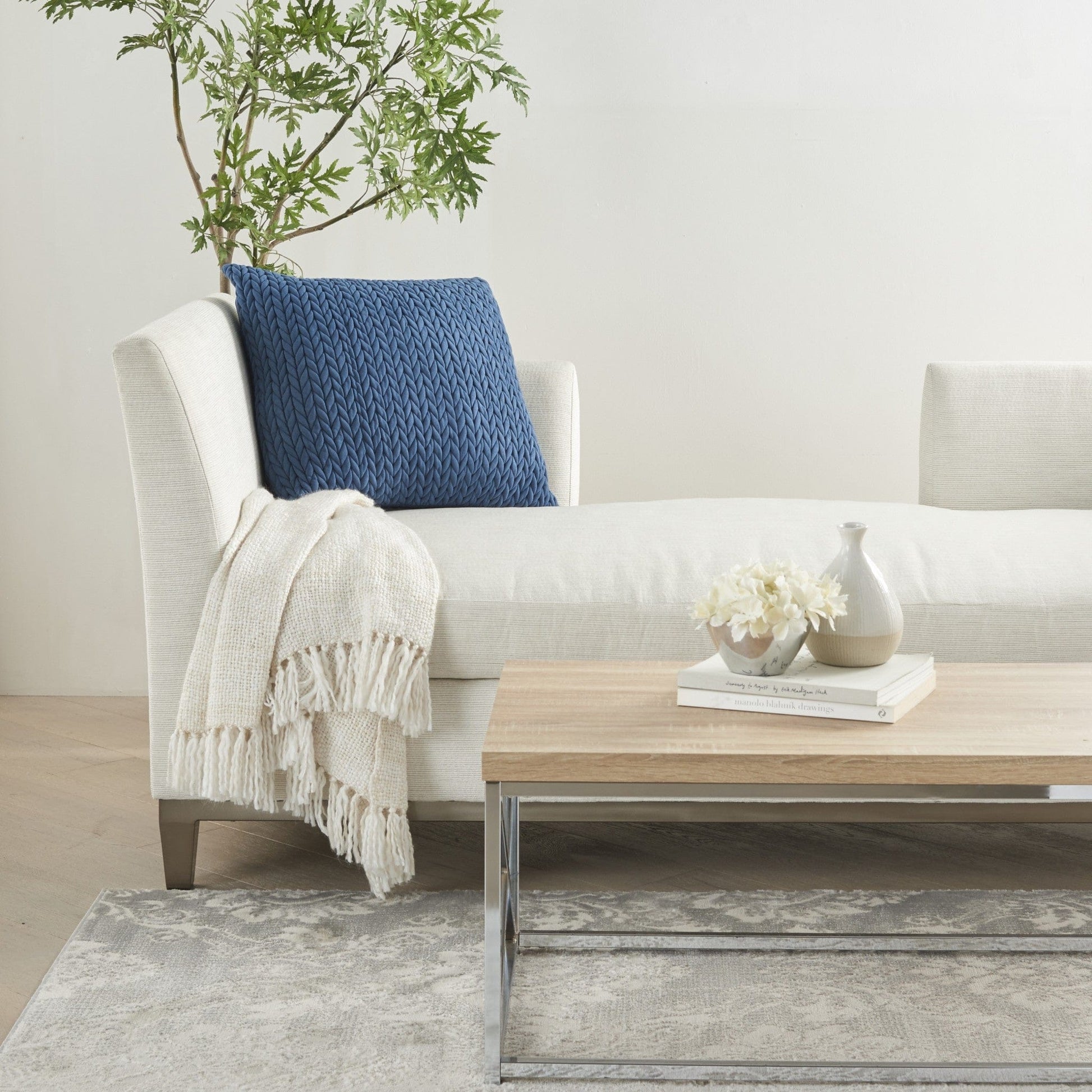 Bring in a sense of elegant comfort to any seating space in your home with this Blue Braided Chevron Throw Pillow. The polyester filling is covered in a stunningly soft and luxurious fabric which has a eye-catching blue color. The chevron pattern on top comes from a tightly braided design which takes the look of your seating area to the next level. The simplicity of this throw pillow makes it perfect for any space in your home no matter what style aesthetic or colors you already have. Match it with similar colors or let it stand out amongst softer hues, the choice is yours! 5" H x 22" W x 22" D