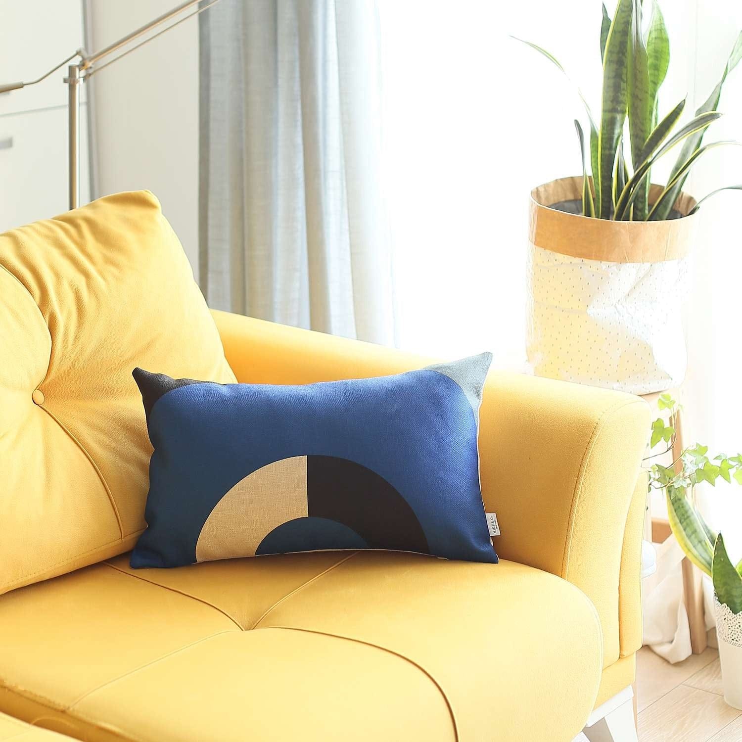 Extruding the aesthetics of modern decor in a sophisticated design, this Blue Half Circle Modern Lumbar Throw Pillow pledges to spruce up your living space instantly. This tetra-colored symphony of dark blue, white, and black is fashioned in three different circular segments that feel harmonious and inviting to the eyes. With careful handwork by Turkish artisans, this pillow is made using premium 100% polyester fabric with OEKO-TEX Standard 100 certification to guarantee safety and comfort. Longevity and color intensity can easily be maintained by spot cleaning whenever marks and stains occur. A seamless and uniform look is achieved with the help of hidden zipper closures while the high-quality insert provides a luxurious feel with a fluffy appearance. Bring cheerfulness into your interior setting with this playful lumbar pillow that promises to make your living space come to life. 12” x 20” x 1”
