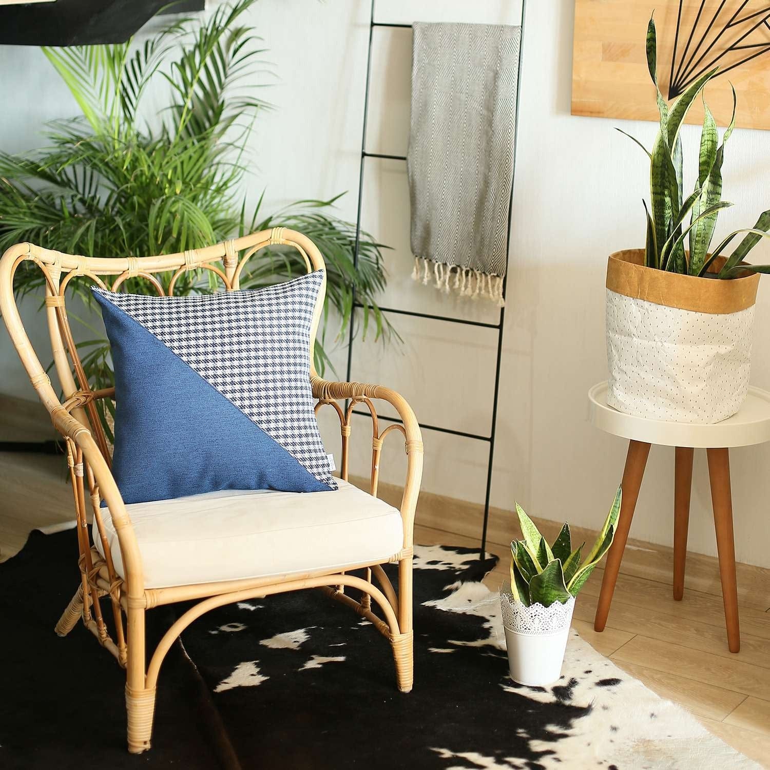 Embracing the sophistication of modern styling, this Blue Houndstooth Modern Decorative Throw Pillow will tie together the aesthetics of your living space with a stylish impression. Made in Turkey with durable polyester fabric which is OEKO-TEX Standard 100 certified to ensure product safety and optimum quality. The fabric should only be spot cleaned to keep its pristine look for years to come. Featuring the houndstooth checkered pattern in black and blue over a white base and diagonally separated from the solid slate blue end to create visual intrigue. Made to feel soft and seamless on the touch, the hidden zipper closure all around does the trick while the soft poly insert contributes to the fluffy look and cozy feel. Place this stylish throw pillow on the sofa, couch, or sitting area and it will add a modern-classic vibe to the room. 18” x 18” x 1”