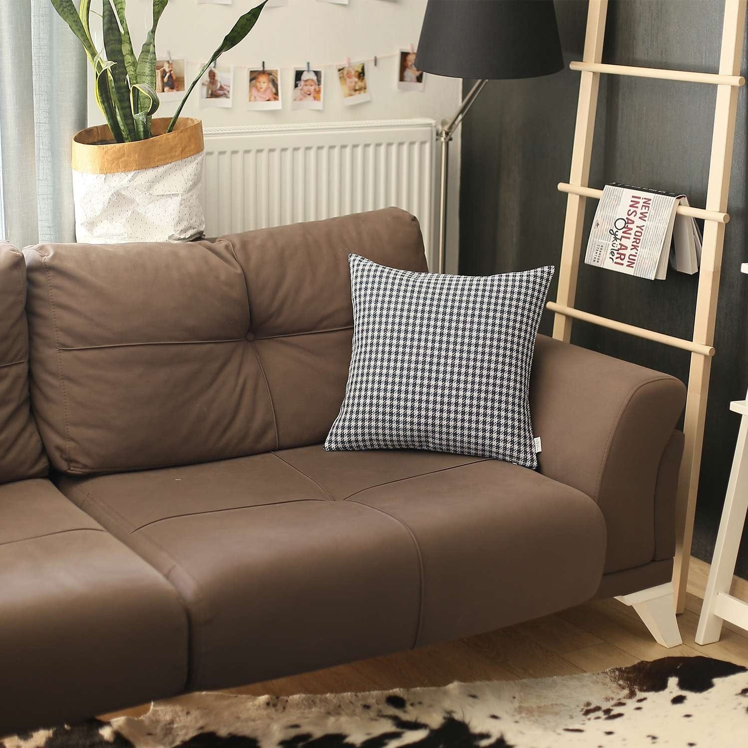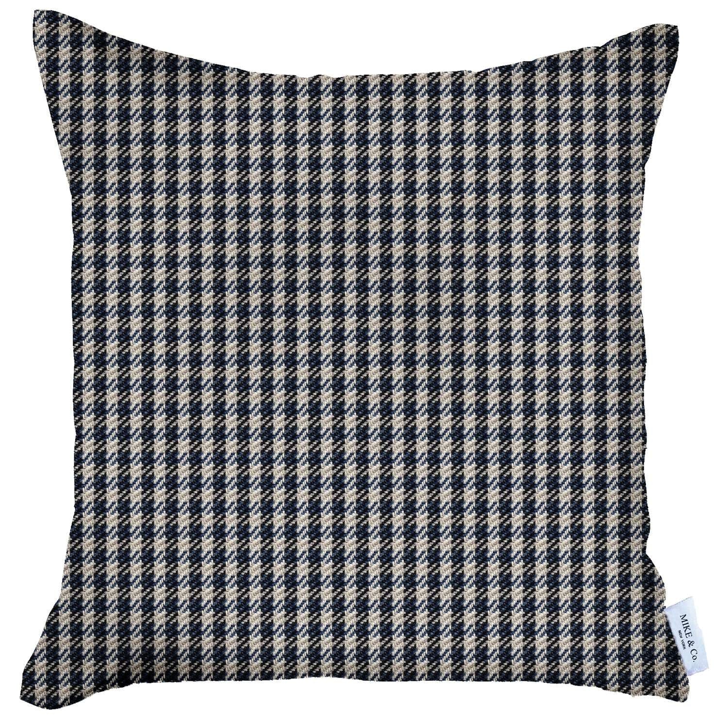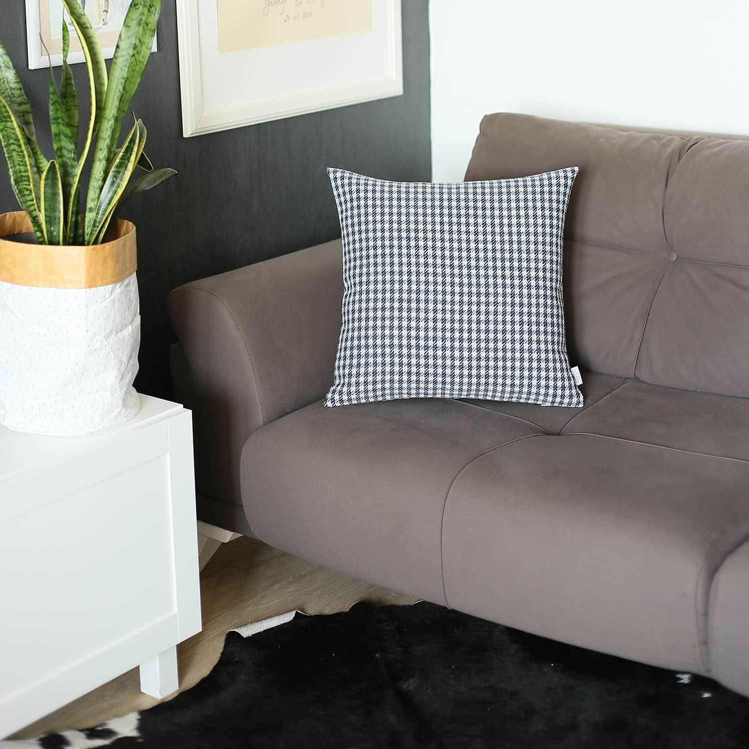 Decorate your living space with this Blue Houndstooth Pattern Throw Pillow that adheres to a classic pattern with a subtle color palette. Beautifully designed with blue houndstooth patterns in jacquard weaving over a white base for a simple yet sophisticated look amidst any surrounding. Handmade in Turkey with 100% premium polyester fabric to ensure durability and color intensity while the OEKO-TEX Standard 100 certification speaks of its top-notch product quality and safety. The edges feel smooth and refined due to its hidden zipper closure while the soft poly filling contributes to its fluffy look and comfort. Aligning with the aesthetics of contemporary styling, this decorative throw pillow will add an understated elegance to your modern home. 18” x 18” x 1”