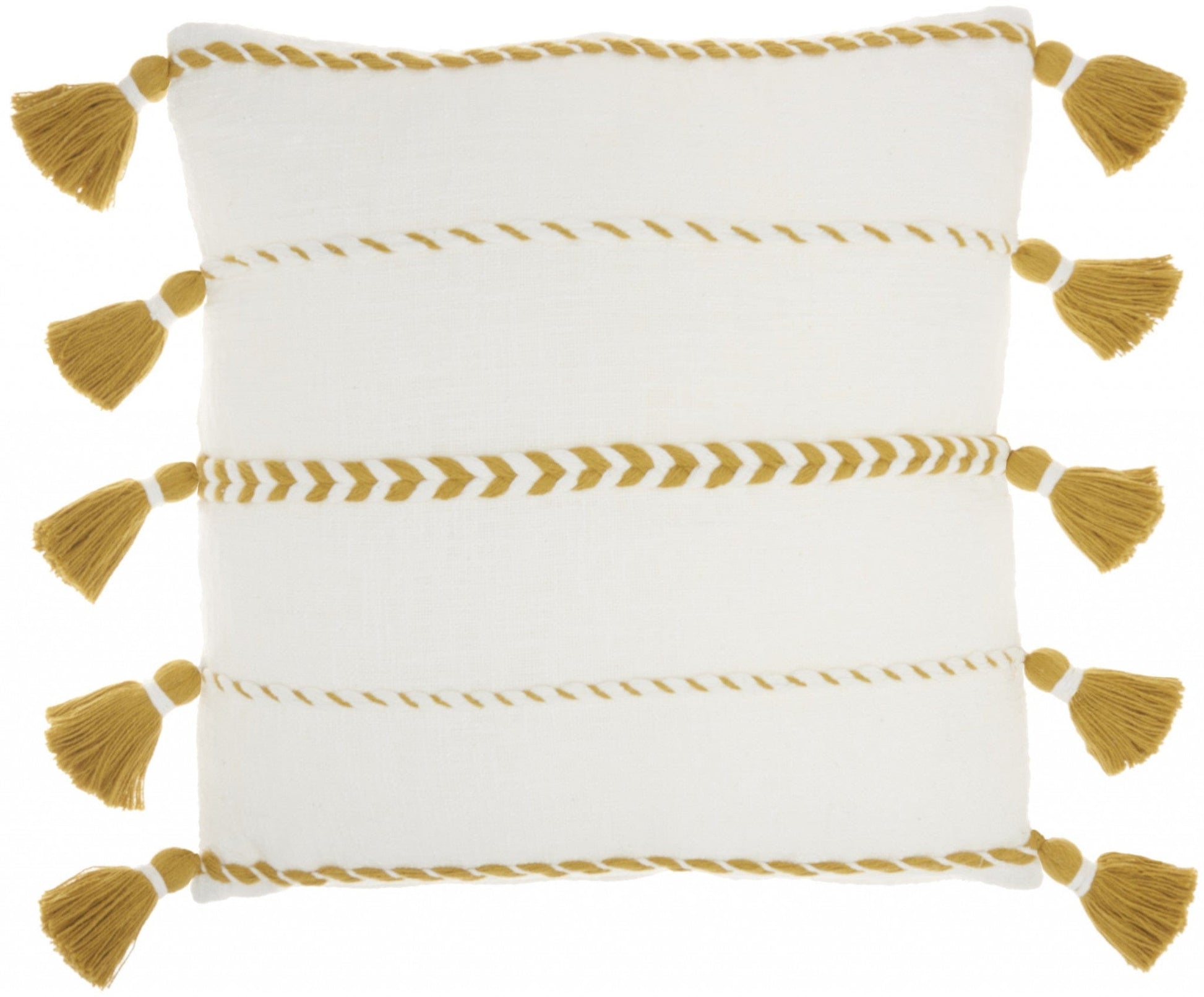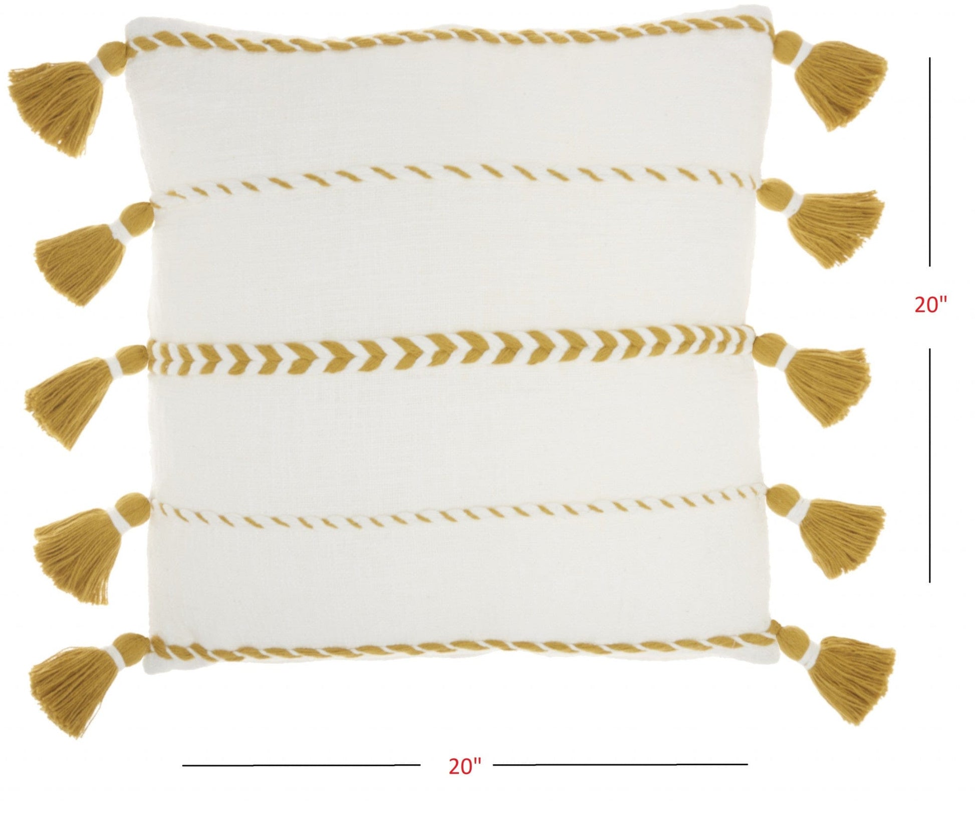 Bohemian White Cotton Accent Pillow With Mustard Tassel Details