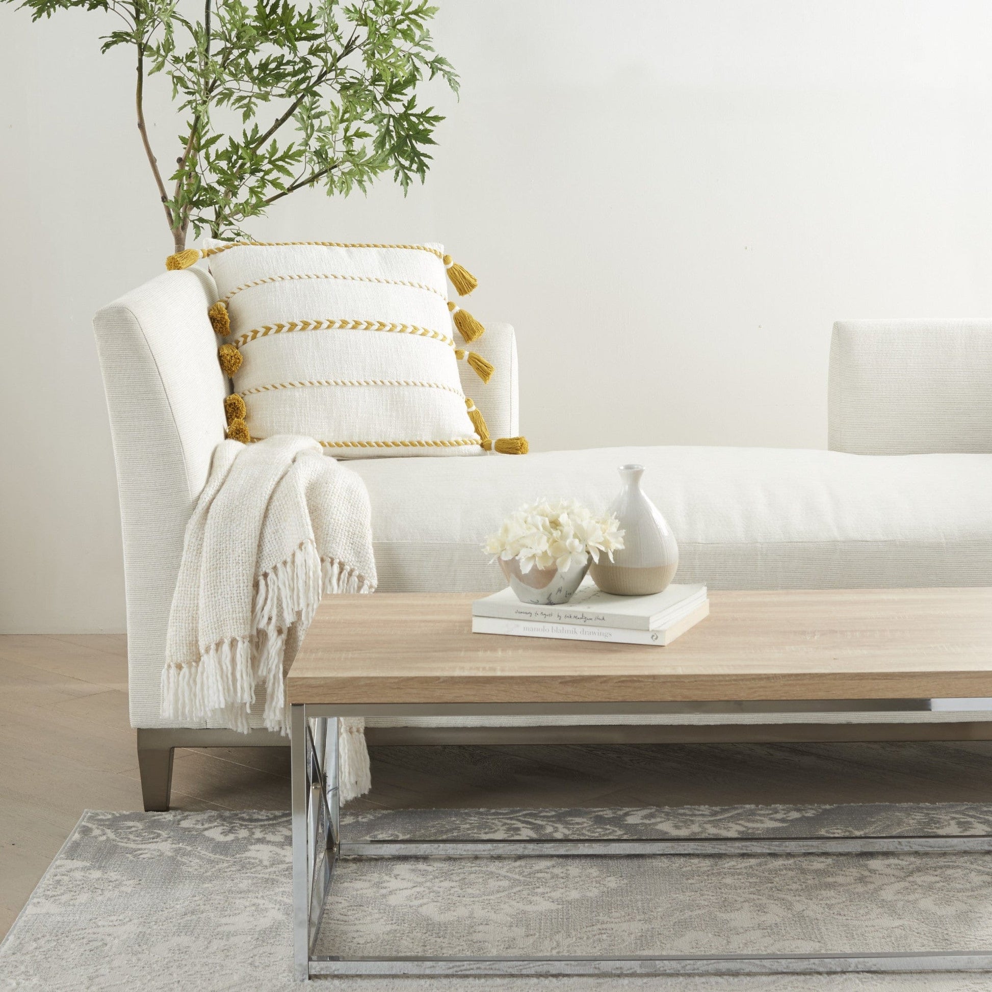 Contemporary and quirky, this Bohemian White Cotton Accent Pillow with Mustard Tassel Details will help bring a Boho-chic style to your interior by offering plush comfort and easy decorating. This throw pillow is expertly handcrafted, making it a unique item that is made with skill and professionalism. The added feature of a zipper closure makes for easy cleaning of the pillow case, allowing for easy care. The pretty mustard tassels on the four corners and the mustard textured braided trellis pattern woven into the front cover adds a great detail and uniqueness to the design and your future pillow setup! 5" x 20" x20"