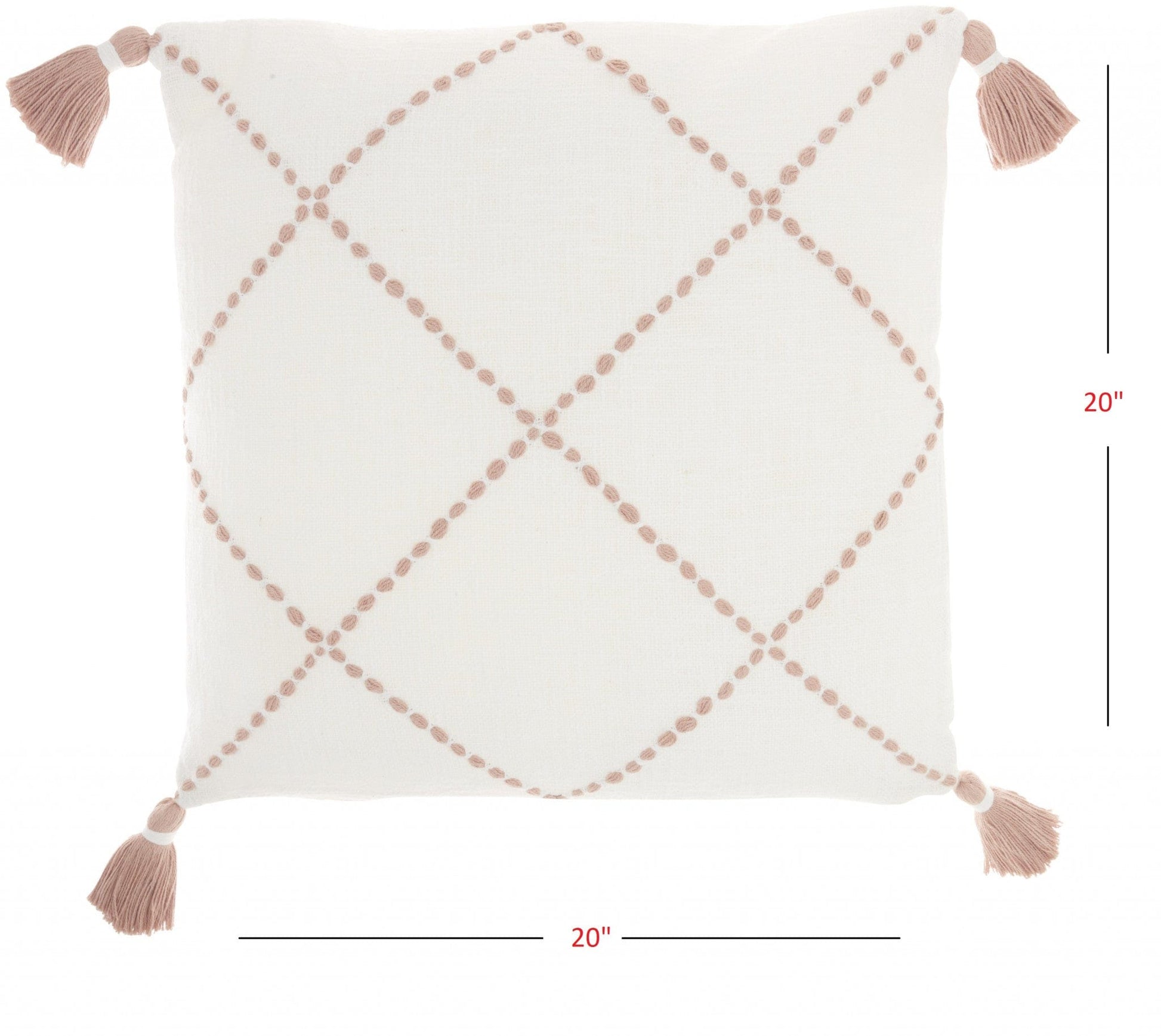 Contemporary and fun, this Boho Blush Pink Cotton Accent Throw Pillow will help bring a Bohemian, chic style to your interior by offering plush comfort and easy decorating. This throw pillow is expertly handcrafted, making it a unique item that is made with skill and professionalism. The added feature of a zipper closure makes for easy cleaning of the pillow case, allowing for easy care. The pretty color of blush pink tassels on the corners and the pink textured braided trellis pattern woven into the front cover adds a great detail and uniqueness to the design and your future pillow setup! 5" x 20" x20"