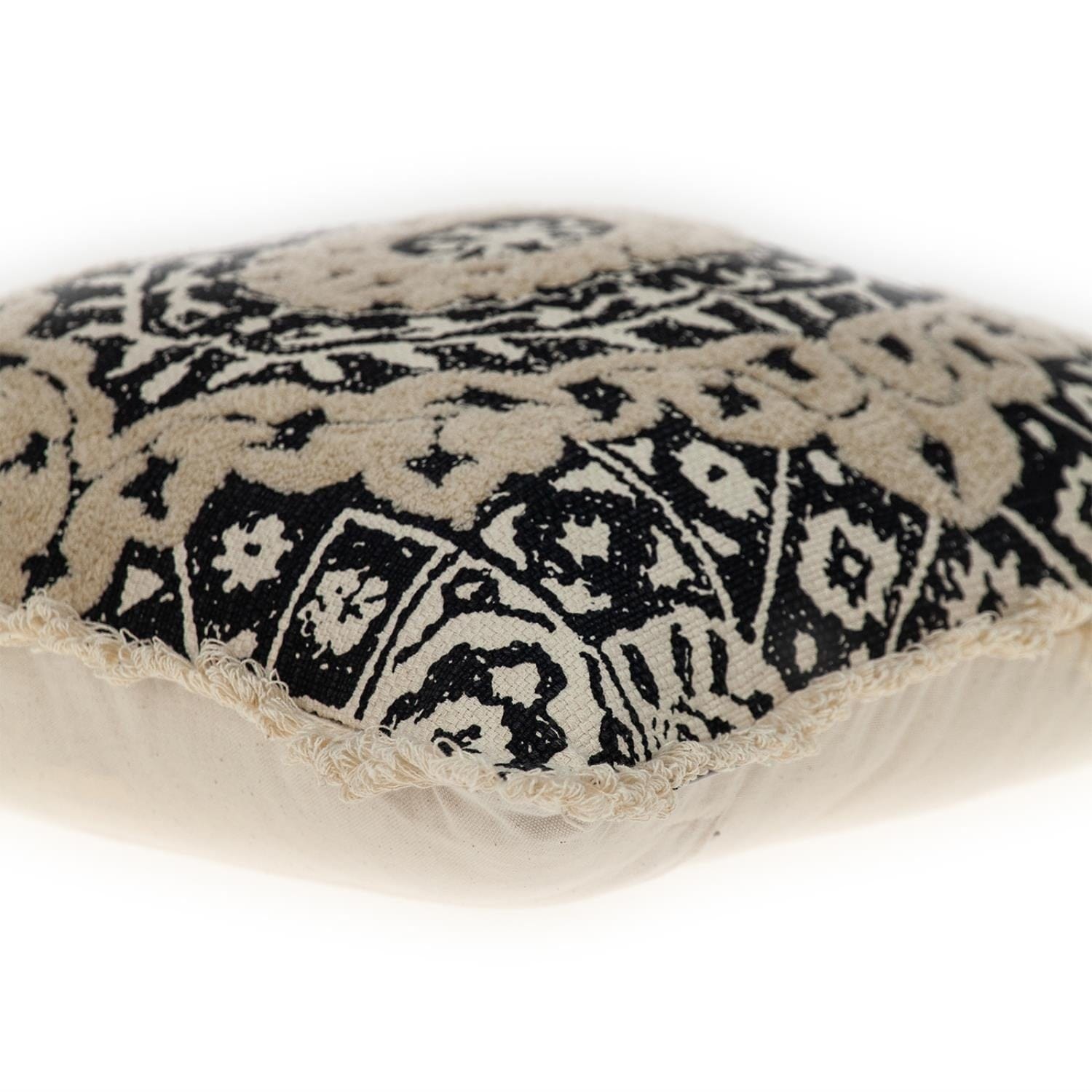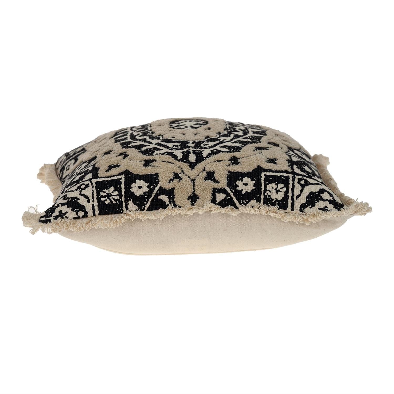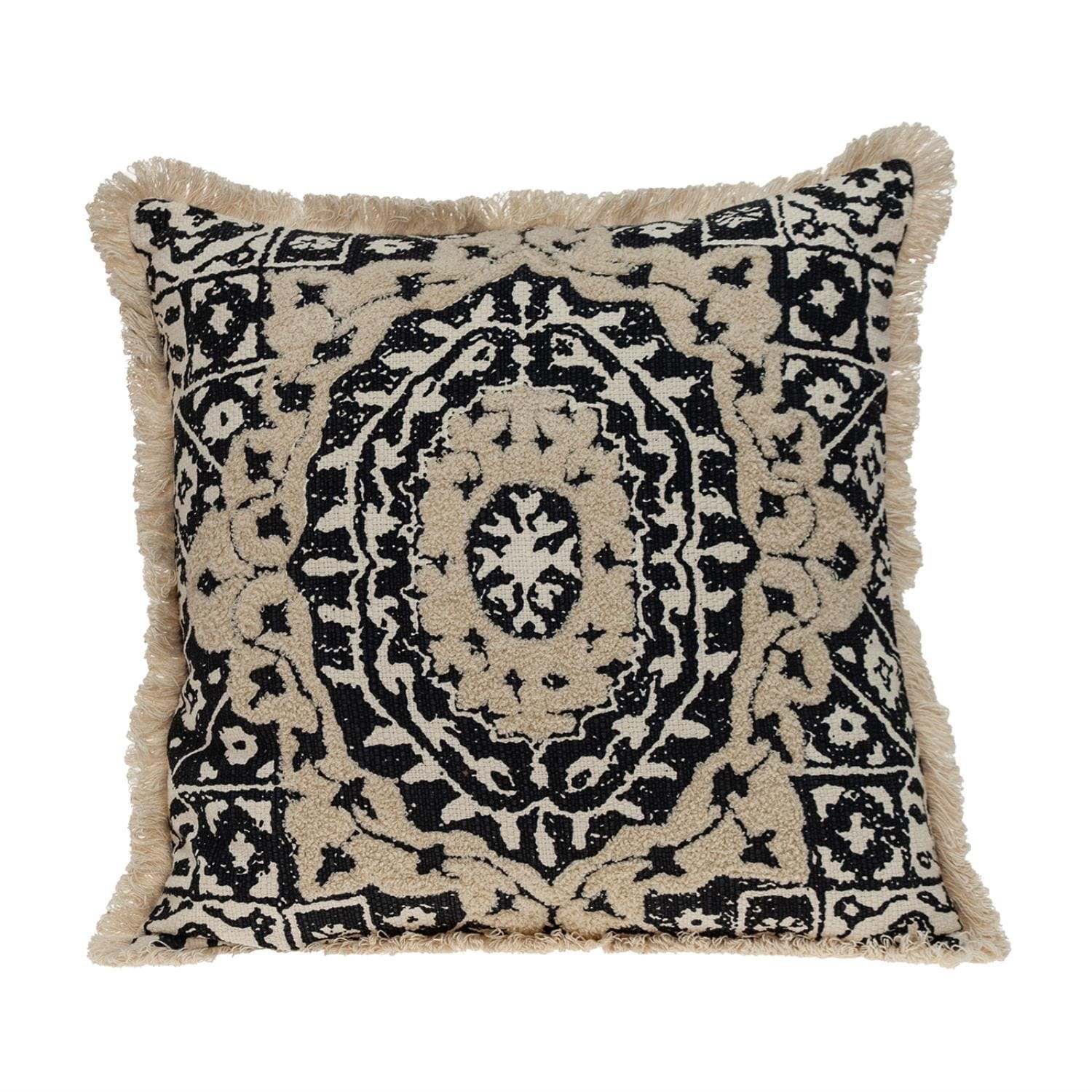 Bohemian in style with a hint of tribal thrown in, this Boho Garland Beige and Black Decorative Accent Pillow is a great way to bring good vibes softness into your space. This square accent pillow features a 100% cotton textured high and low detailing on the front in beige and a distressed black decorative garland abstract floral design. Soft beige fringe finishes this cool pillow off on all four sides. Attractive and comfortable this decorative pillow is great for the bed, sofa, or your favorite chair. The solid backside includes a flap disguising a zipper for easy insertion/removal of the soft polyester filling. 18" x 18" x 4"