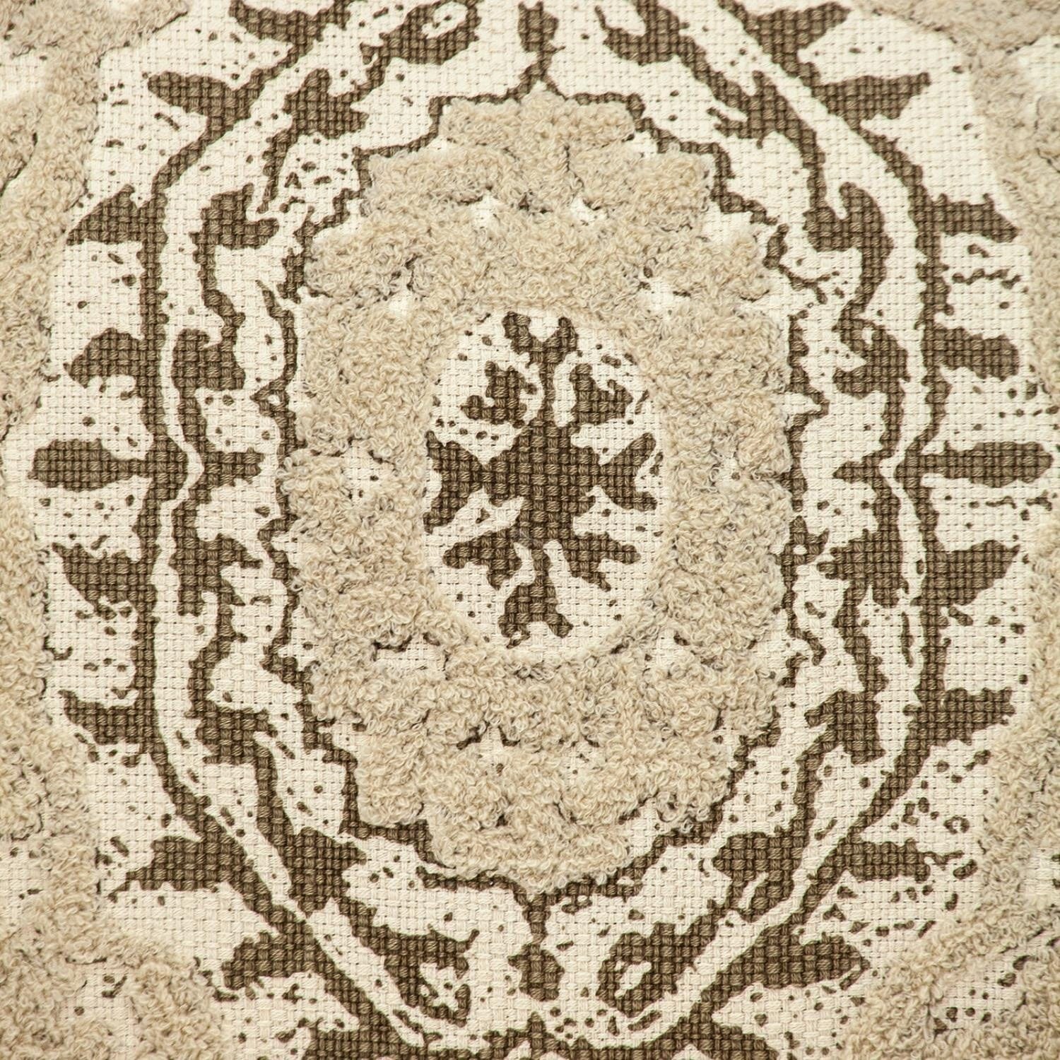 Bohemian in style with a hint of tribal thrown in, this Boho Garland Beige and Brown Decorative Accent Pillow is a great way to bring good vibes softness into your space. This square accent pillow features a 100% cotton textured high and low detailing on the front in beige and a distressed brown decorative garland abstract floral design. Soft beige fringe finishes this cool pillow off on all four sides. Attractive and comfortable this decorative pillow is great for the bed, sofa, or your favorite chair. The solid backside includes a flap disguising a zipper for easy insertion/removal of the soft polyester filling. 18" x 18" x 4"