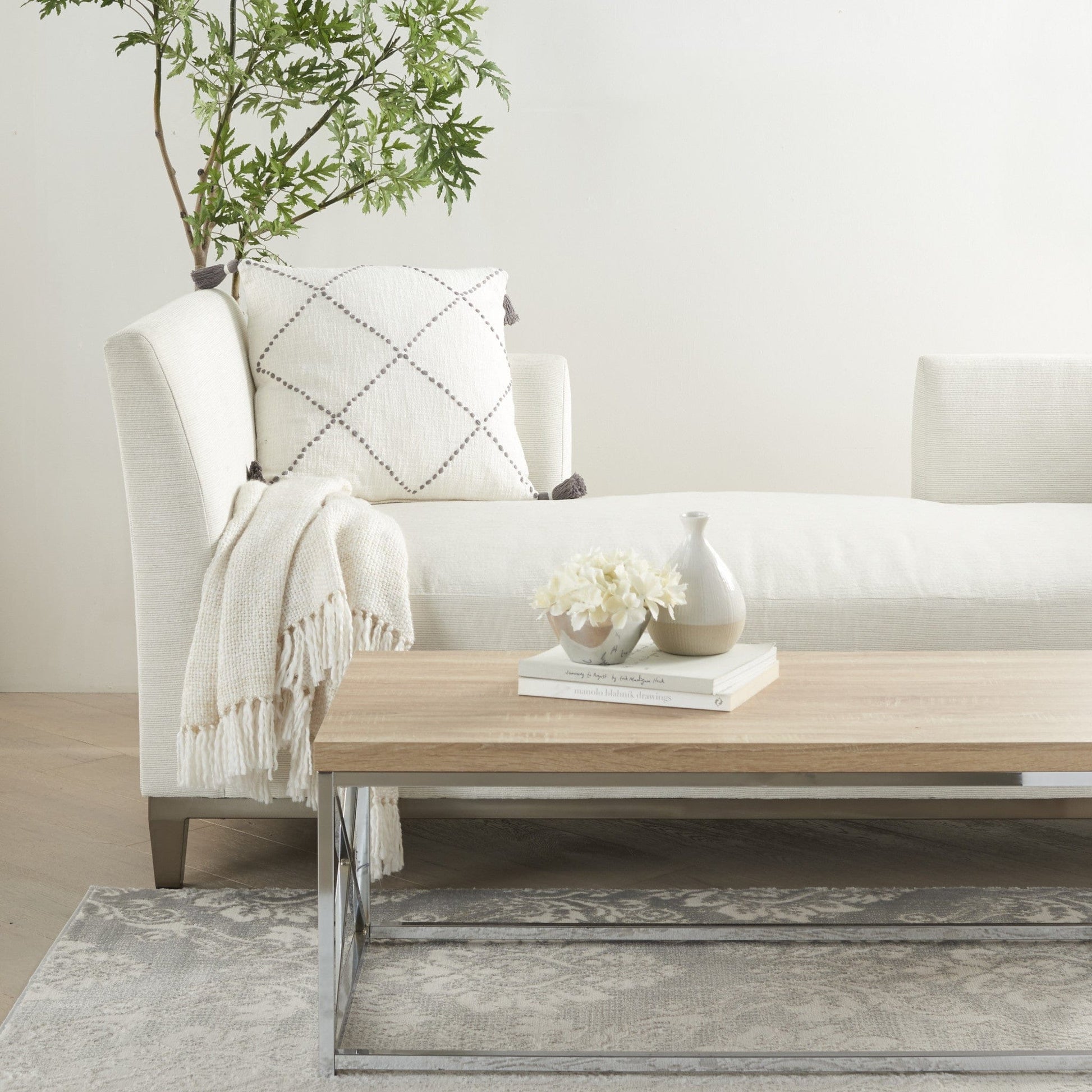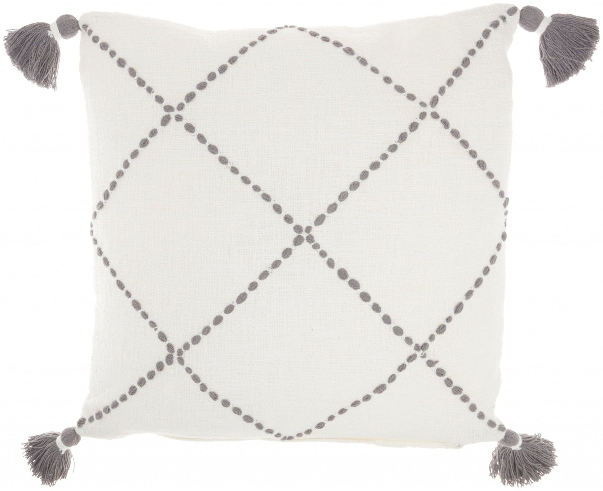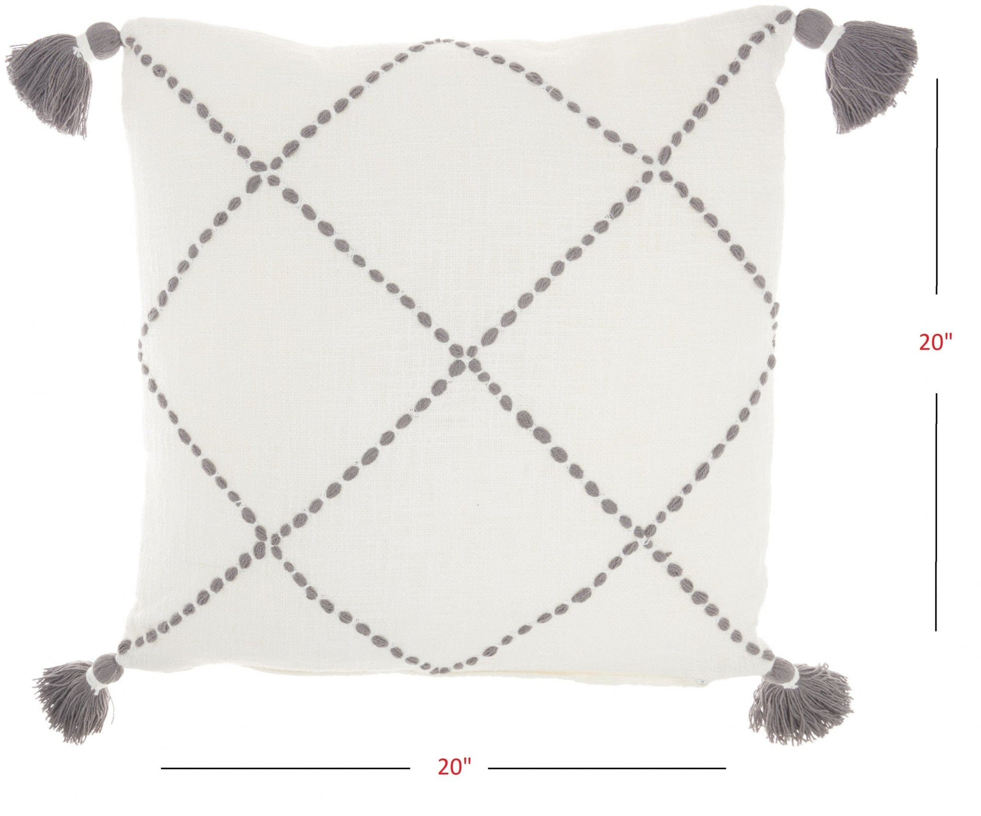Contemporary and fun, this Boho Grey Cotton Accent Throw Pillow will help bring a Bohemian, chic style to your interior by offering plush comfort and easy decorating. This throw pillow is expertly handcrafted, making it a unique item that is made with skill and professionalism. The added feature of a zipper closure makes for easy cleaning of the pillow case, allowing for easy care. The modern color of grey tassels on the corners and the grey textured braided trellis pattern woven into the front cover adds a great detail and uniqueness to the design and your future pillow setup! 5" x 20" x20"