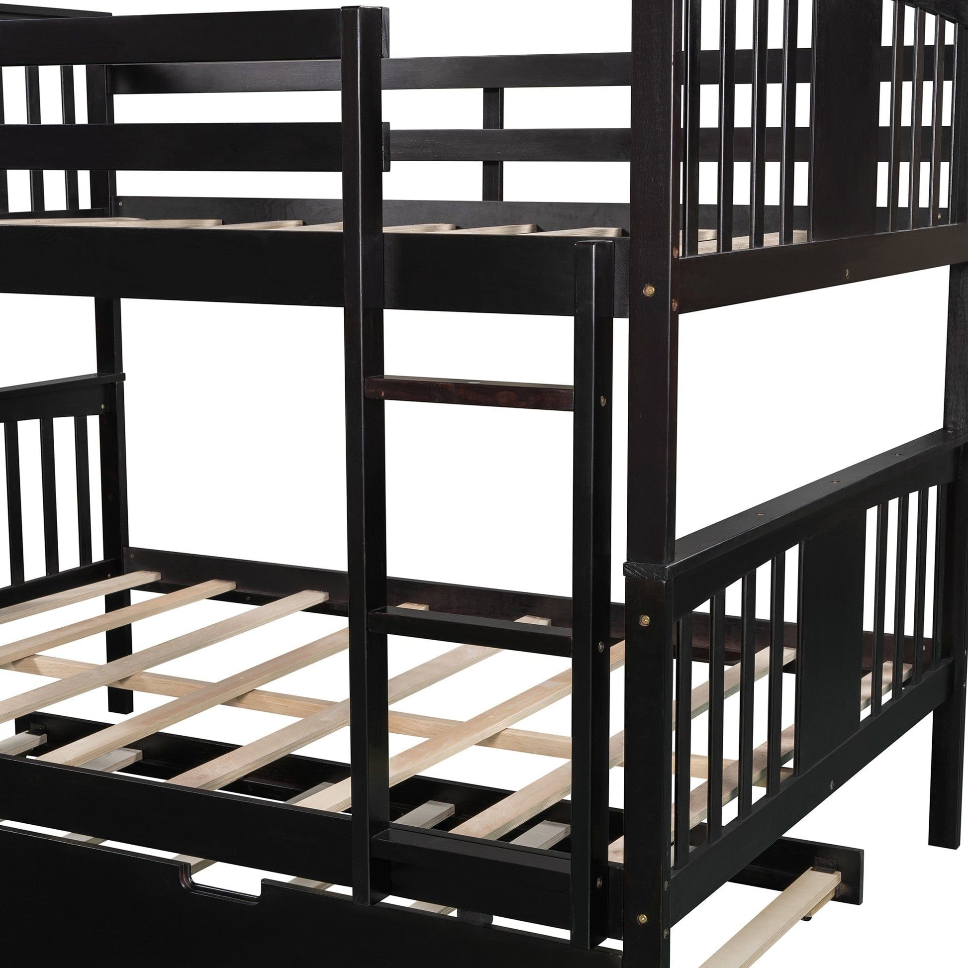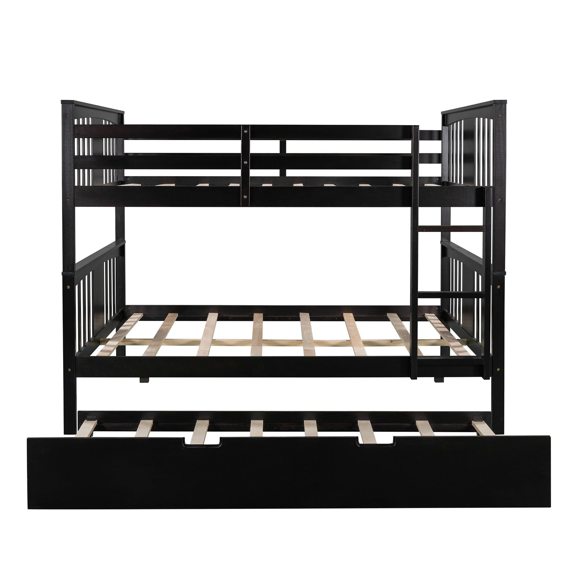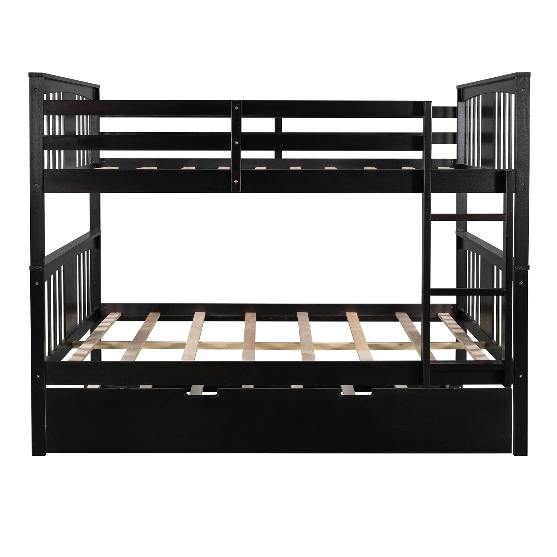 Space-saving and super comfortable, the Brown Double Full-Size + Twin Trundle Bunk Bed is the perfect option for children's rooms. It features two bunk Beds that can be used together or separately and an additional trundle for sleepovers. The two bunk Beds come with a headboard and footboard while the top bunk Bed comes with an additional full-length railing for maximum safety. All three Beds have wooden slats that provide comfort and superb mattress ventilation. This bunk Bed set comes in a beautiful espresso brown finish that makes it a lovely sight in any Bedroom. 80" L x 57" W x 63" H