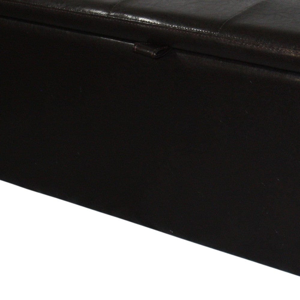 A stylish solution to your storage needs, the Brown Faux Leather Storage Bench is the perfect accent piece for your entryway, bedroom, or living room. It features a front opening storage compartment with an all-metal mechanism. The high-density polyfoam seat will provide optimal comfort and support, and the bench is masterfully upholstered with beautiful brown leather to achieve that eye-catching look. Perfect for adding extra seating and storage in your master bedroom! Crafted with a solid wood frame, this attractive bench will last for years to come. 18.5" H x 40" W x 17" D