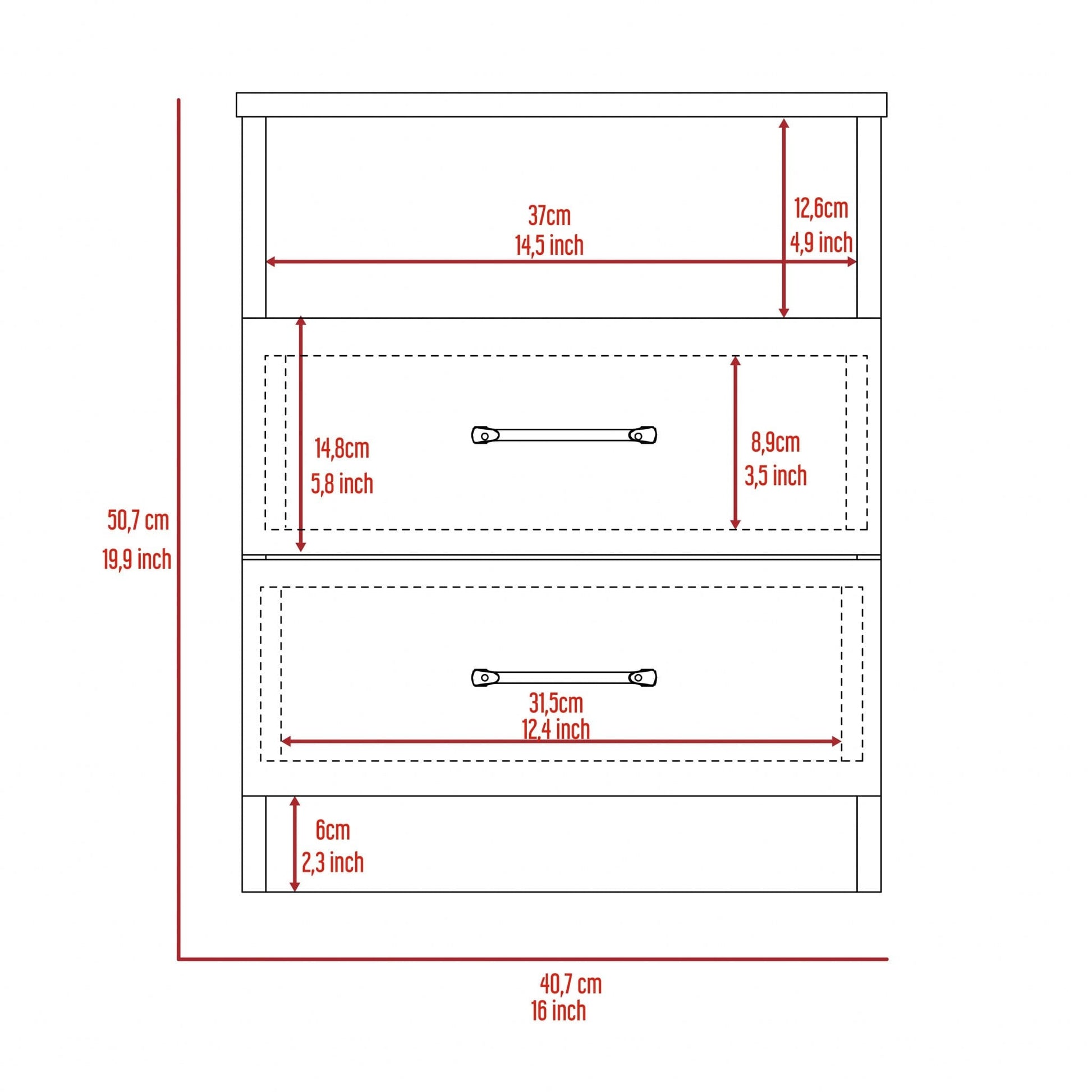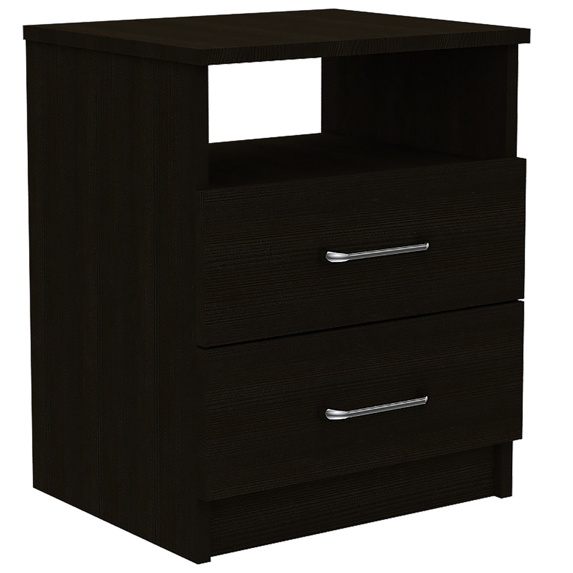 Modern design and practical styling meet to form the good-looking Brown Open Compartment Two Drawer Nightstand. The two pull-out drawers with silver handles and one open compartment provide lots of storage to help keep your space neat and organized. Versatile in use this nightstand would also work as a great storage end table in the living room on either side of the sofa or anywhere else you need fashionable and stylish storage. 19.9" x 16" x 13.3".