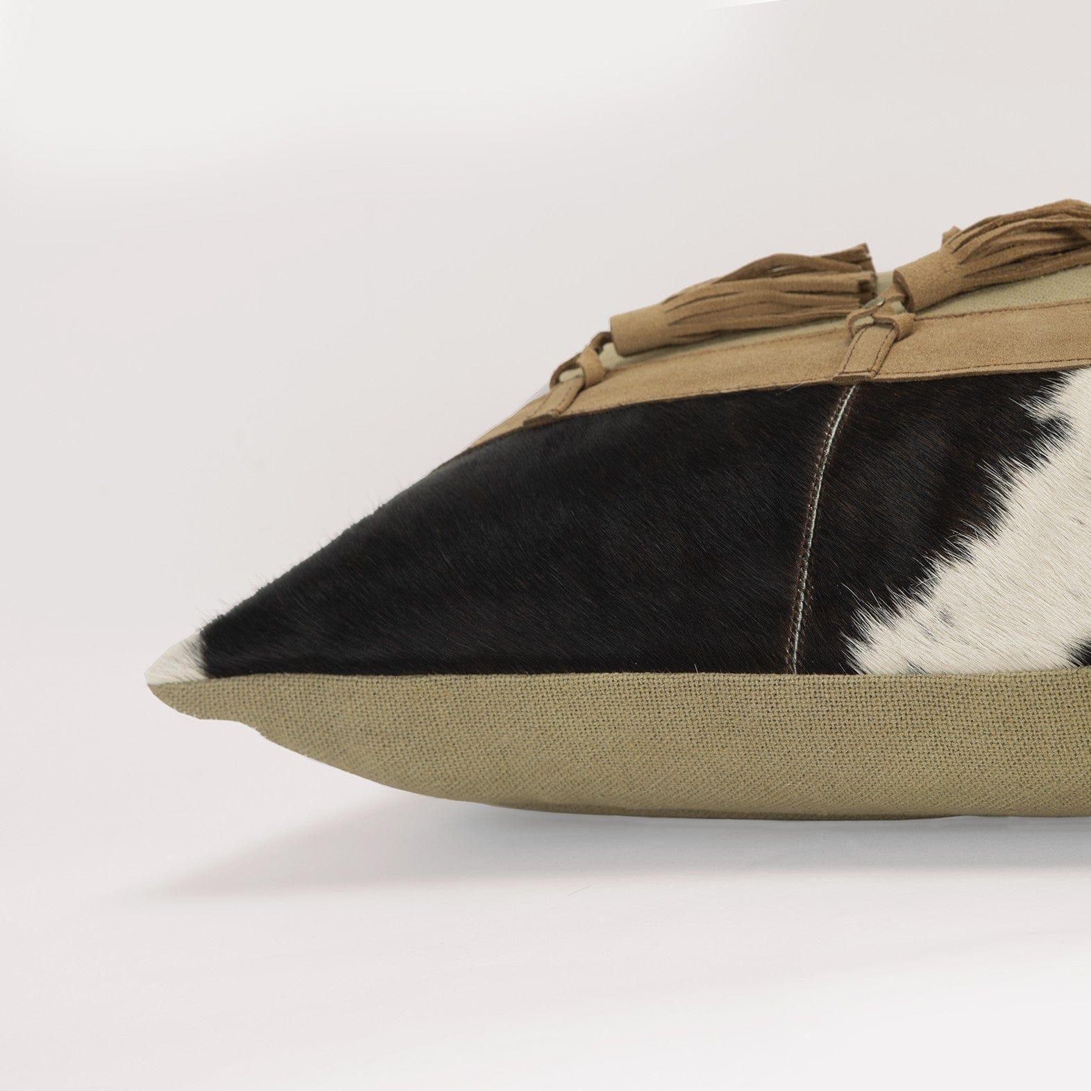Embodying a sense of elegance with its earthy hues, this Brown Tassel Embellished Decorative Throw Pillow will be an ideal accent to add a classic touch to your living room. The pillow features felted tassel embellishments suspended on a brown band with one side in a hair-on-hide leather pattern while the other a solid brown tone for a farmhouse appeal. Crafted from a blend of cotton and leather fabric, this poly-filled pillow is soft yet sturdy to last for a long time. The knife edging adds to the crisp and clean corners for a polished look while the solid coordinating back features a hidden zipper closure for convenience. Lend a modern farmhouse tone into your living room with this uniquely designed decorative lumbar pillow on the sofa or couch. 26” x 14” x 6.25”