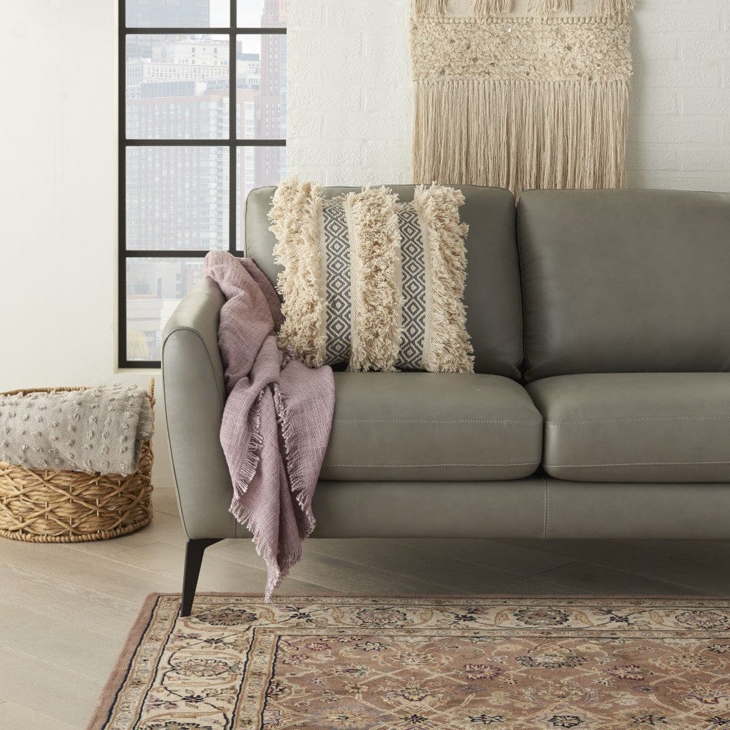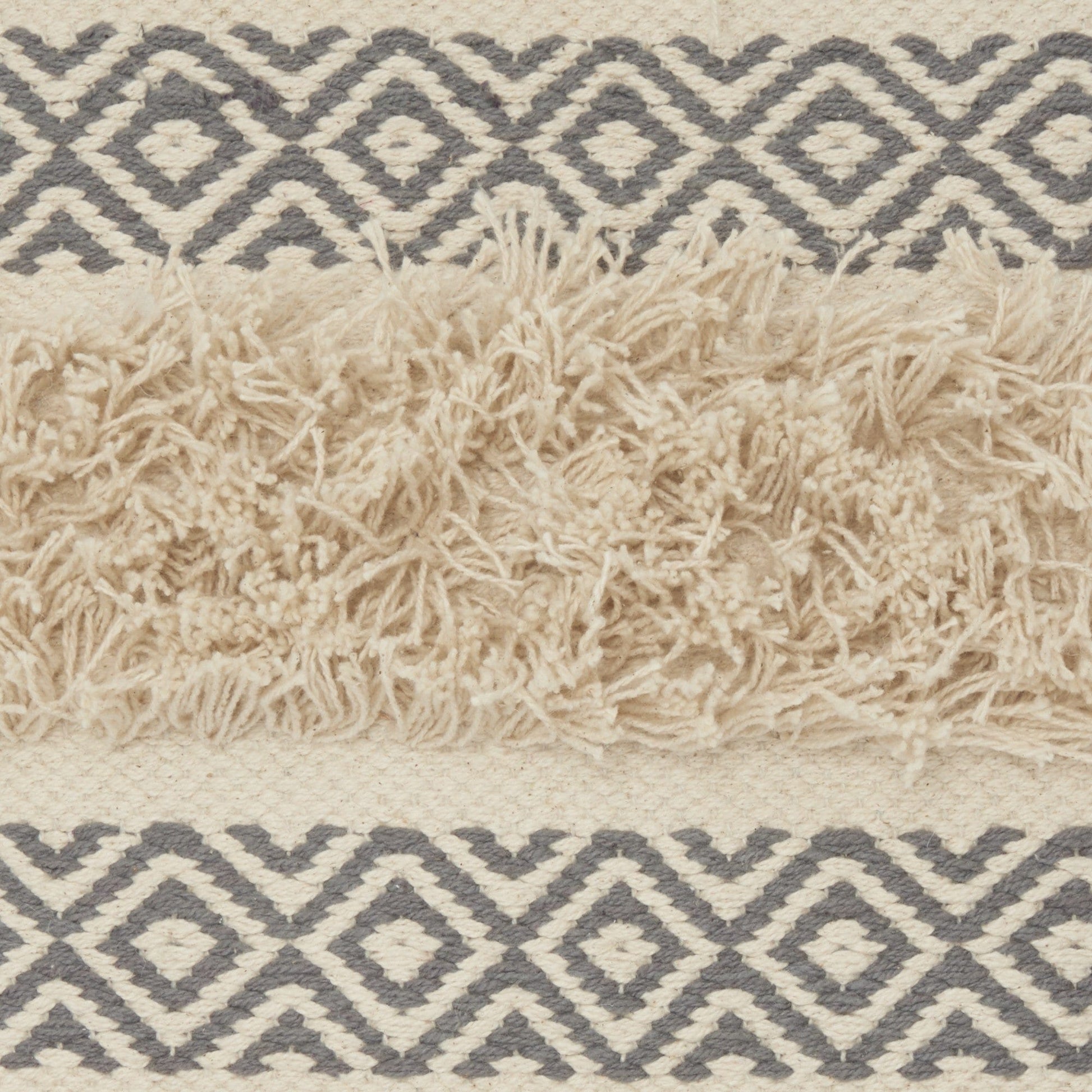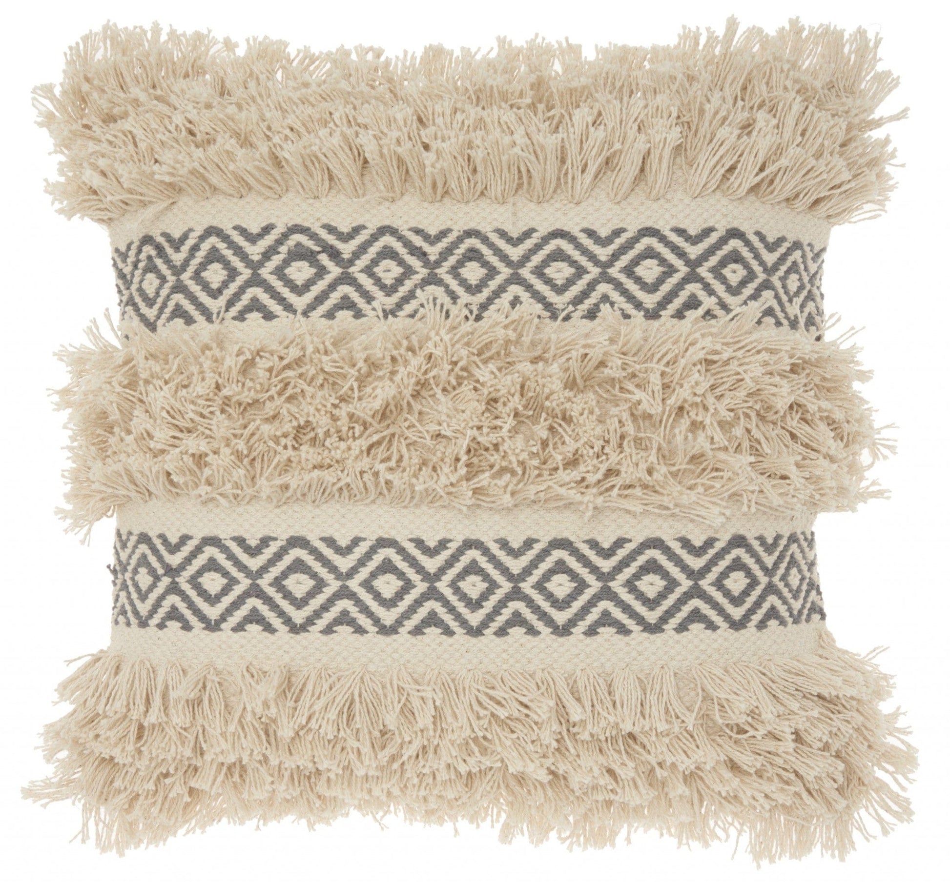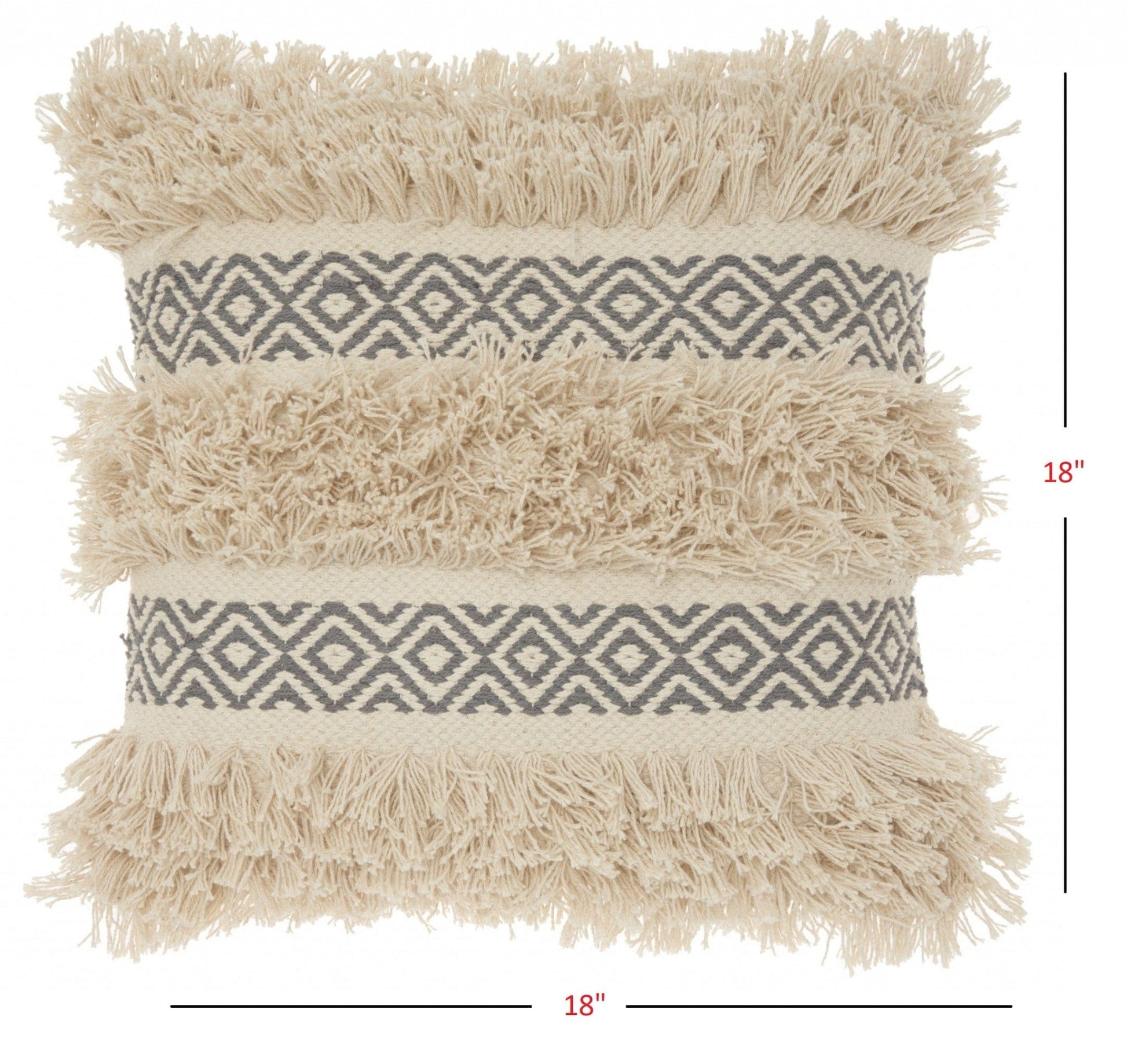 This Charcoal Diamond Patterned Throw Pillow is the physical embodiment of fun, funk, and fluff. The ingenious design does well in shining a warm light of comfort and coziness to any space it is taken to. The super-soft fringes and striped diamond pattern layer give the best of both worlds being comfortable and engaging. The look is made to be long-lasting due to the implementation of 100% cotton fabric throughout the body of the pillow. Express your creativity and bohemian styling in the most elaborate and fun way with this simple add-on that is bound to make your space feel warm and happy. 18” x 18” x 5”