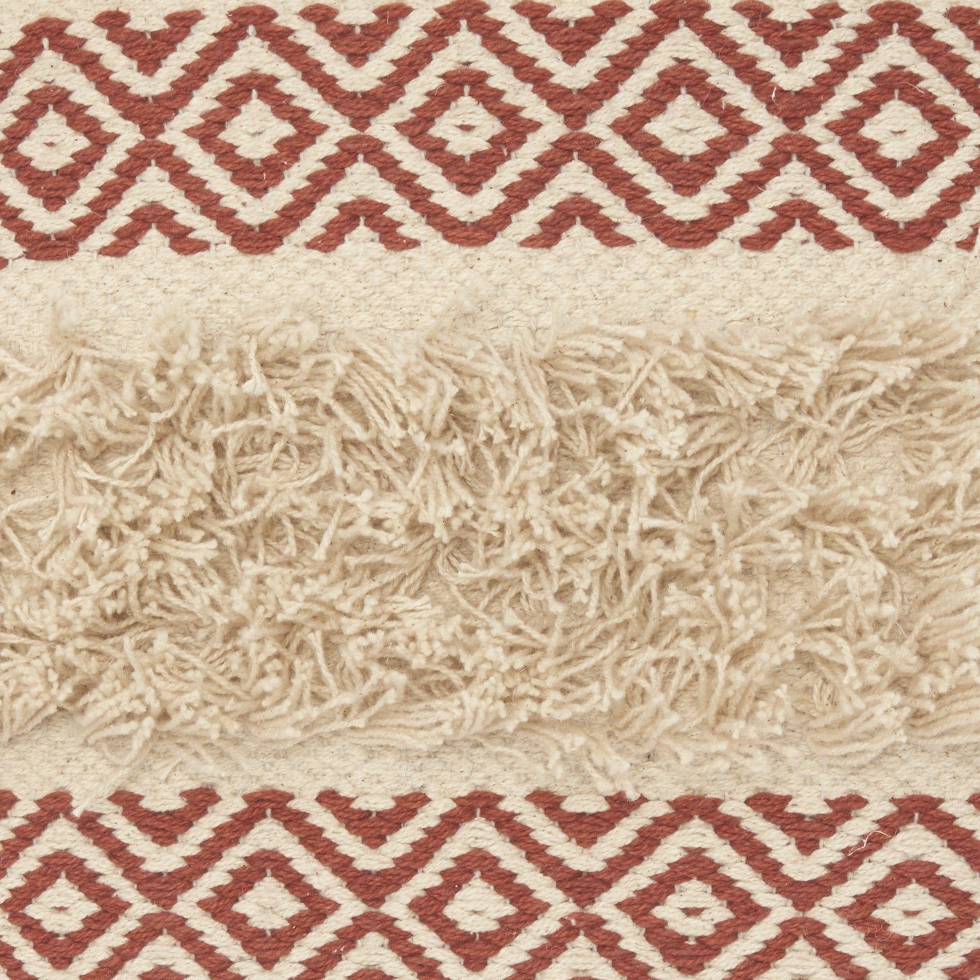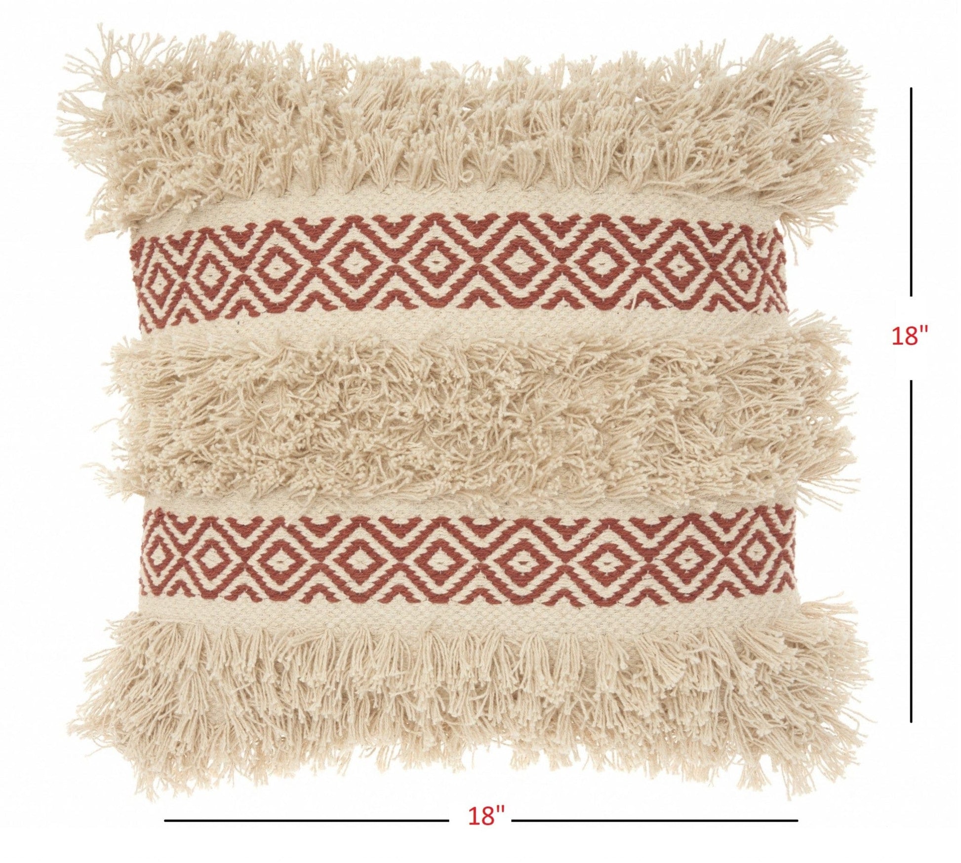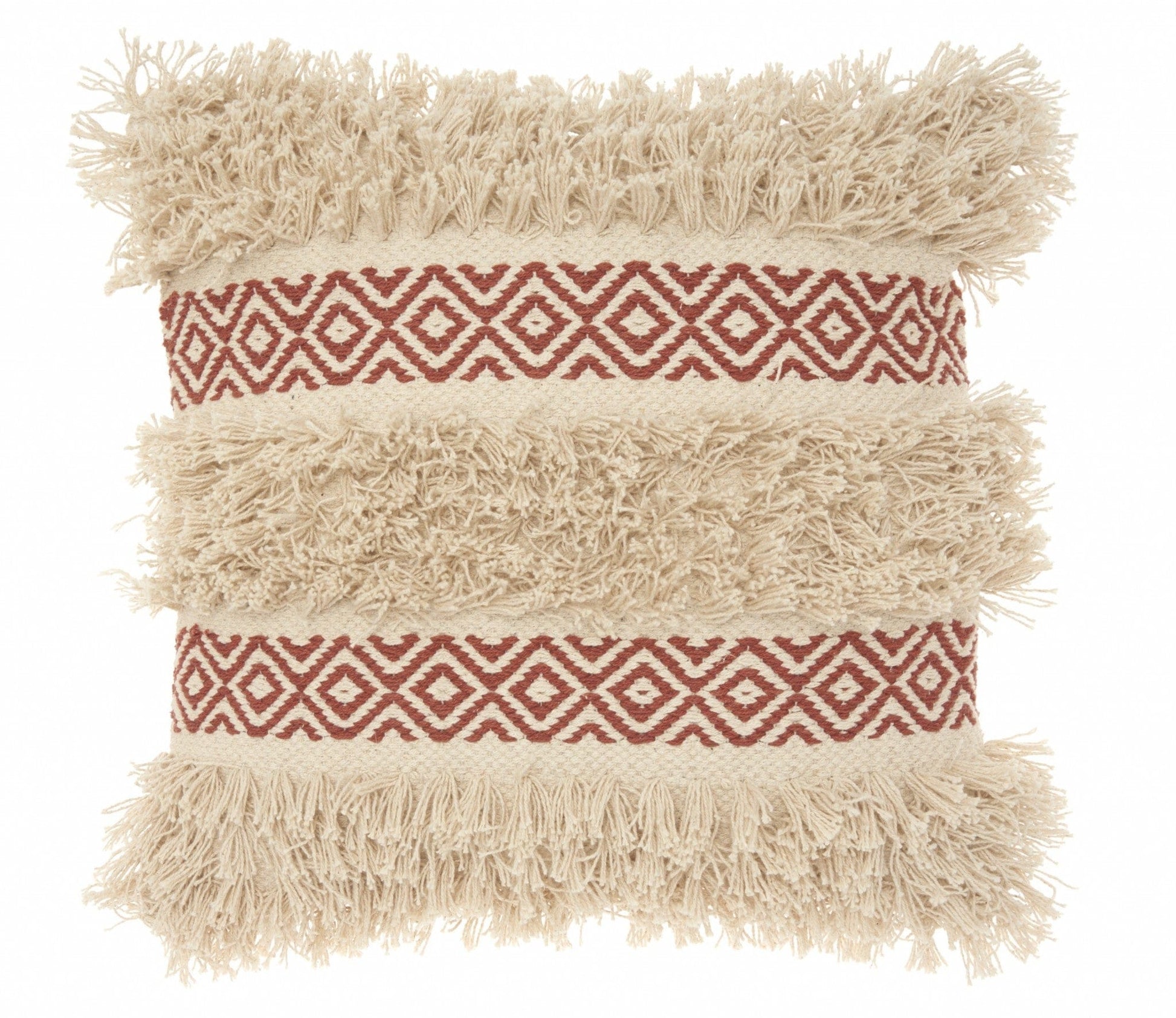 This Clay Diamond Patterned Throw Pillow is the physical embodiment of fun, funk, and fluff. The ingenious design does well in shining a warm light of comfort and coziness to any space it is taken to. The super-soft fringes and striped diamond pattern layer give the best of both worlds being comfortable and engaging. The look is made to be long-lasting due to the implementation of 100% cotton fabric throughout the body of the pillow. Express your creativity and bohemian styling in the most elaborate and fun way with this simple add-on that is bound to make your space feel warm and happy. 18” x 18” x 5”