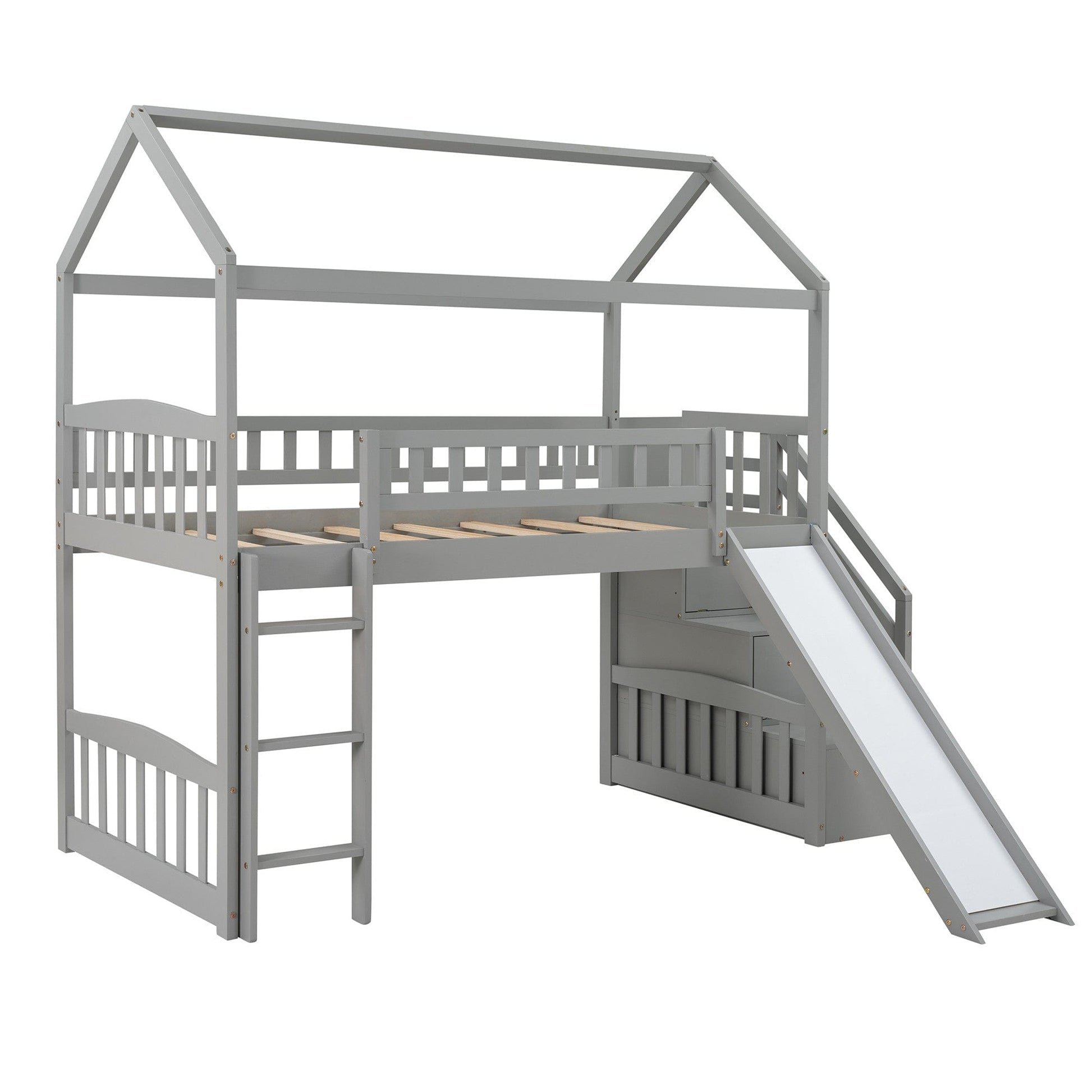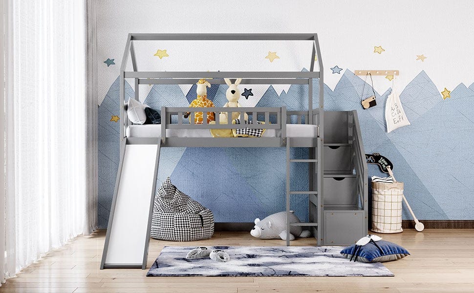Cool Gray Twin Size Loft Bed with Slide and Storage