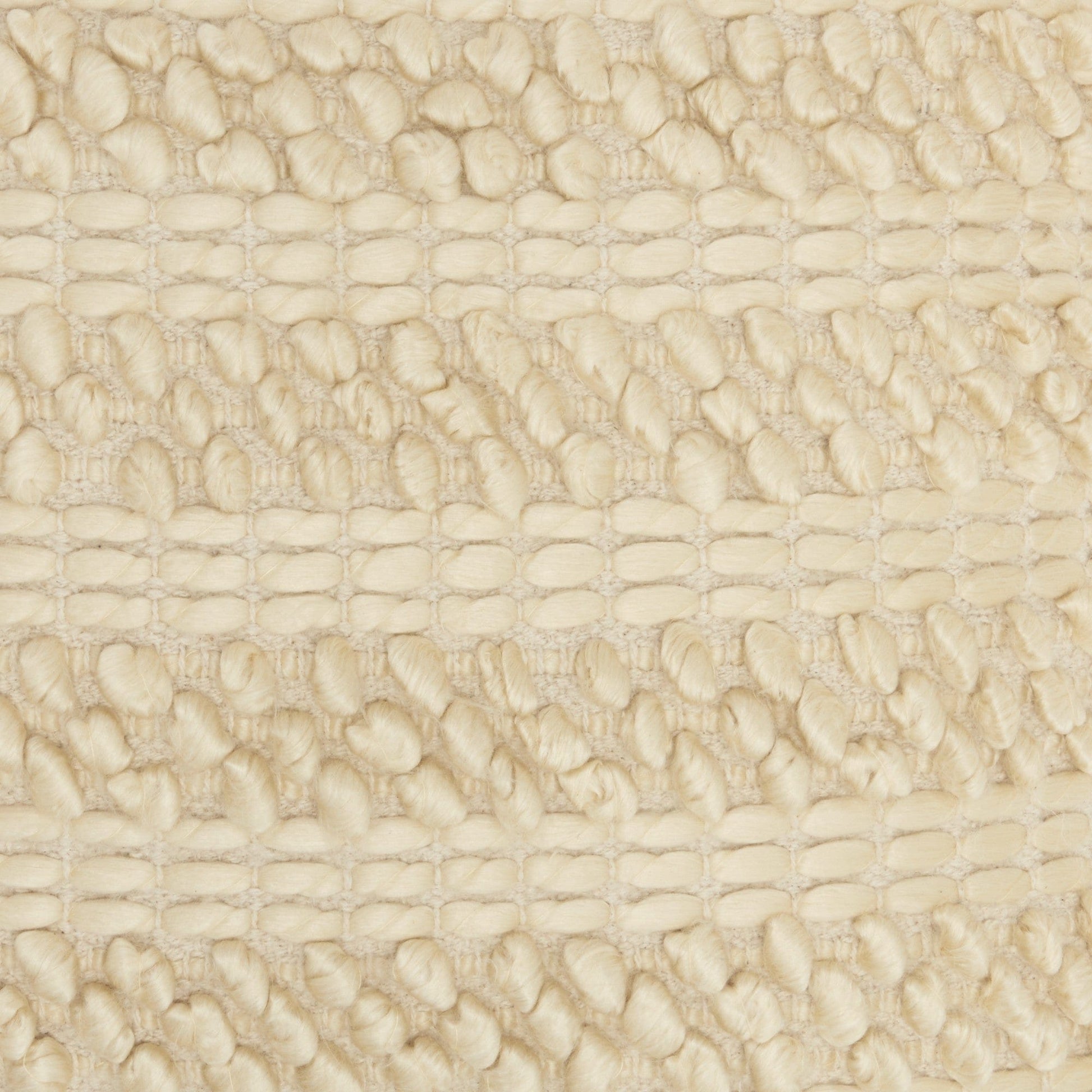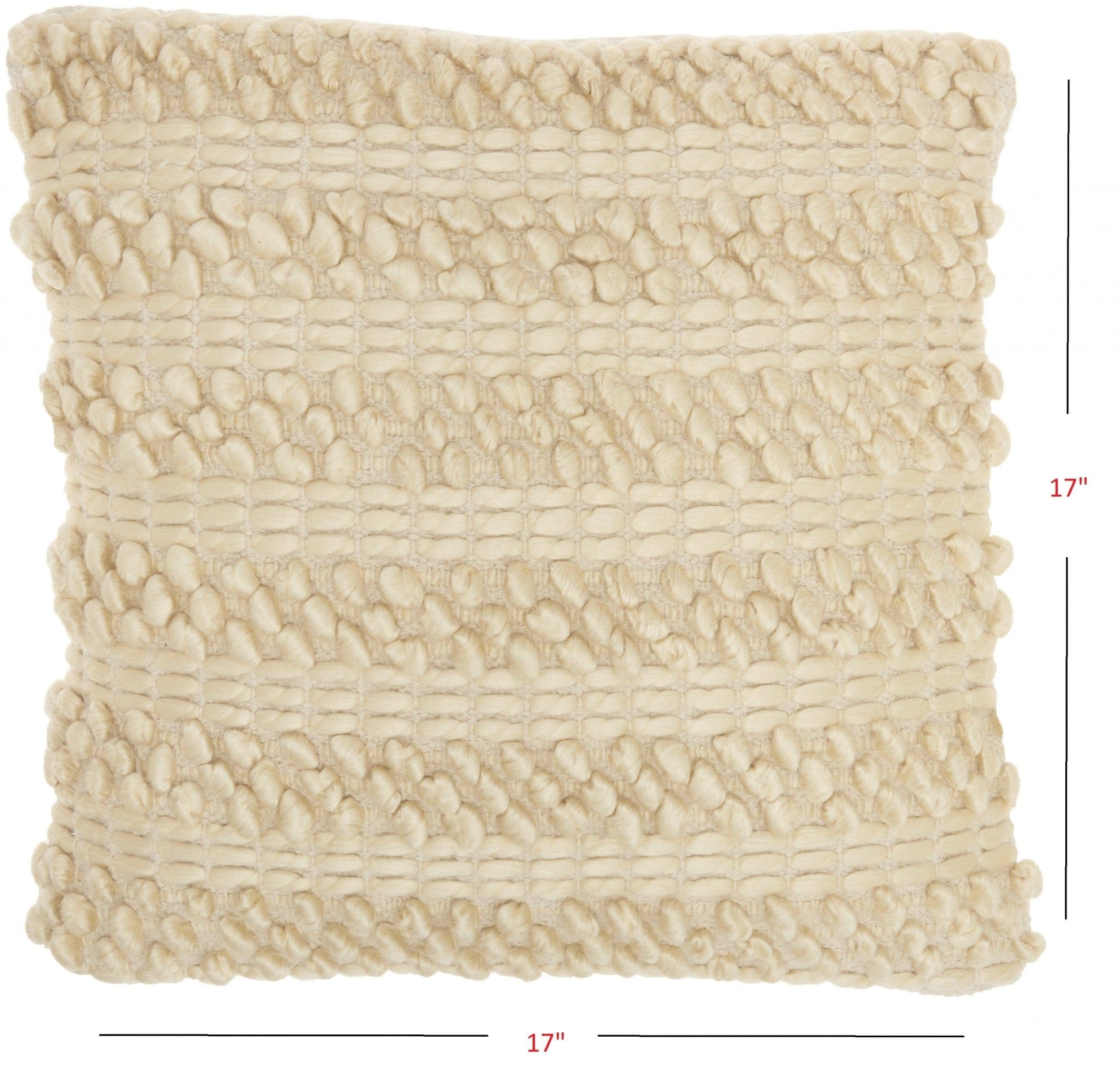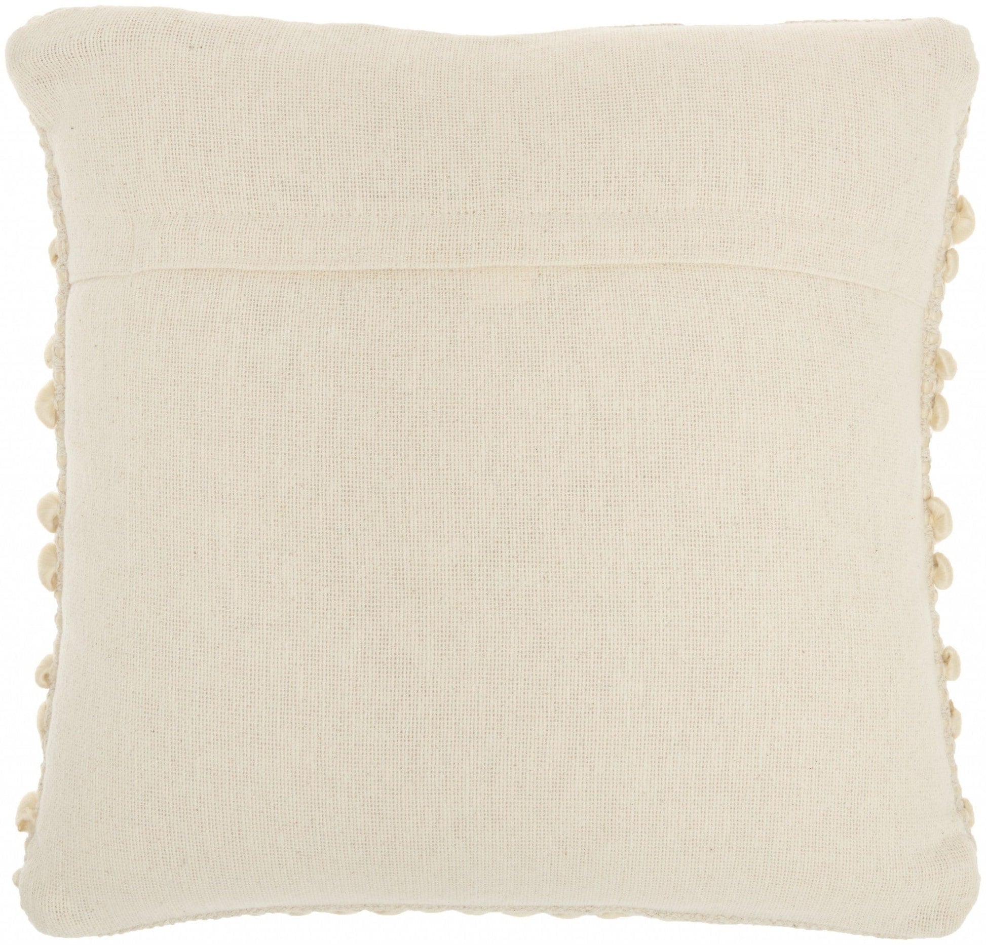 Add a touch of unique design and comfort to any seating space in your home with this Cream Pom-Pom Detailed Throw Pillow. This pillow has a square shape with a hidden zip closure at the back for a seamless look. The cover is covered in a cream colored fabric which has a striped design on top of it. There are two designs in the stripes with one stripe with an embroidered pattern and one stripe with a textured small pop-pom pattern. These stripes alternate and give a very textured feel to the pillow. You can use this pillow anywhere in your home and it will work with any existing colors or decor style you already have, You can use this pillow to elevate the look of your bed, your couch, or your favorite chair. 5" H x 17" W x 17" D