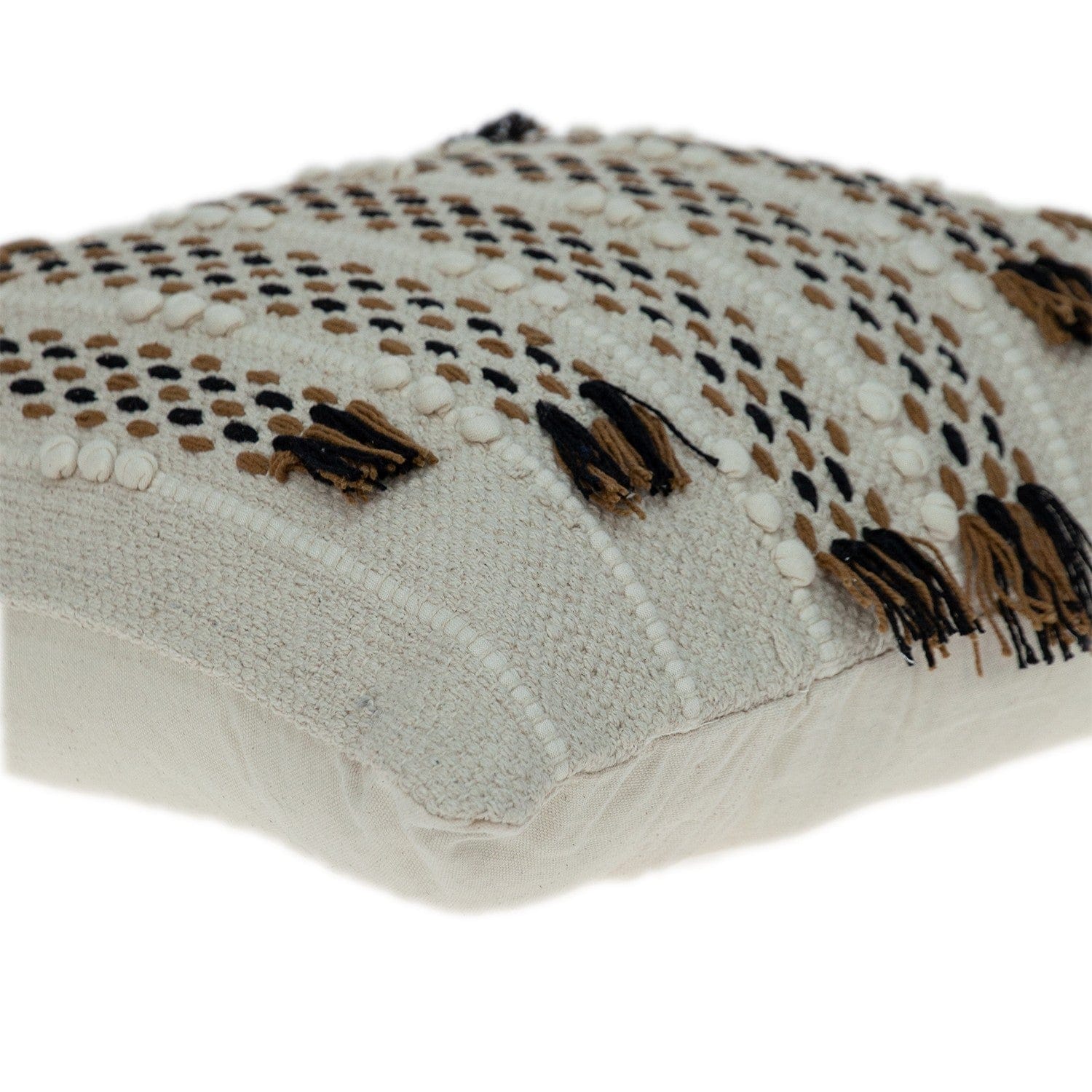 The Creamy Beige Textured Throw Pillow comes in a modern knitted design with a woven pattern and various textures that make it feel cozy and warm. It is a combination of creamy beige, black, and brown colors, with multicolor fringes that enhance its modern finish. The back of this decorative pillow is solid and there is a zipper closure on the back as well. 17.7” x 17.72” x 4”