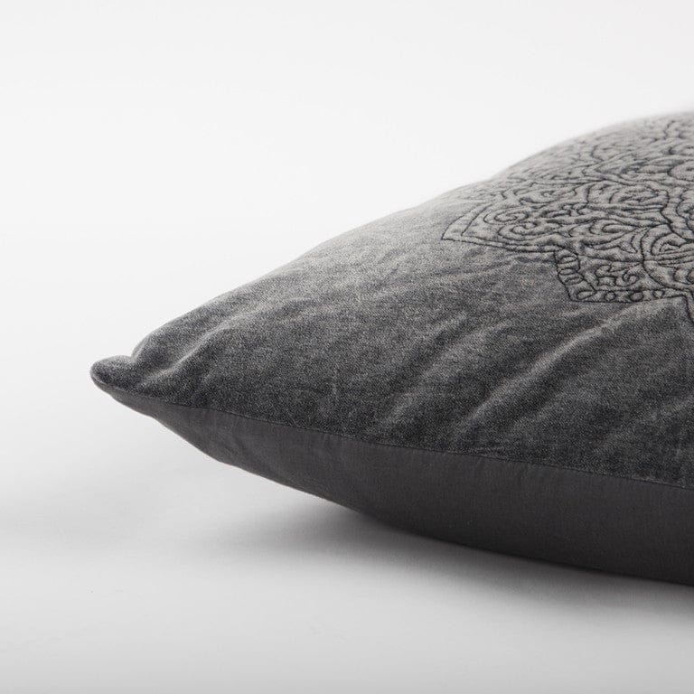 This bold Dark Gray Central Medallion Throw Pillow exudes an industrial mid-century vibe that will flawlessly complement any modern-day décor. Stonewashed with an intricate floral medallion embroidered at the center over a dark gray background, the pillow has a visually sophisticated and vintage allure. A plush cotton velvet fabric envelops both sides of the pillow with a hidden zipper closure on the back for ease of cleaning. The knife edging of the pillow adds to the crisp and clean corners, giving it a polished look, while the polyfill insert ensures a comfortable and cozy texture with a fluffy nature. Add a touch of vintage glam to your interior décor with the addition of this bold decorative throw pillow placed against neutral or soft-toned backgrounds. 22" x 22" x 6.25”