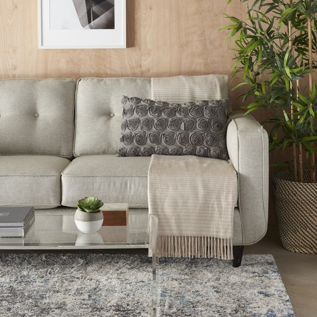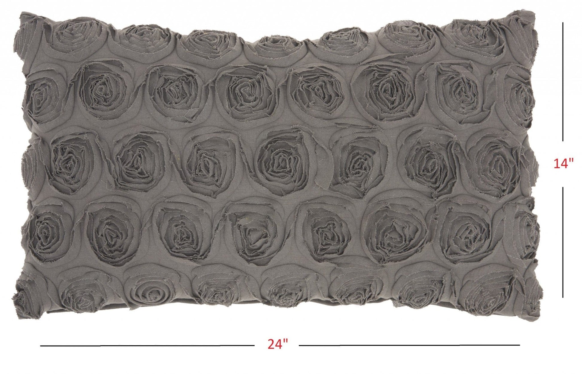 This Dark Gray Embossed Rose Lumbar Pillow is the perfect combination of minimal design and comfort and will elevate the look of your seating spaces. This pillow has a rectangular shape and is covered in a smooth dark gray colored fabric. There is a hidden zip closure at the back which gives a very seamless look to this pillow. On top of the dark gray background, loose rose shapes cover the whole front side of the pillow. These rose shapes have an embossed feel to them and are made from the same fabric in a circular weave. You can use this throw pillow anywhere in your home, on your bed, on your couch, and even on your favorite chair. 5" H x 14" W x 24" D